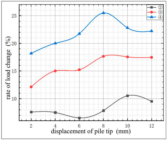 The rate of change in the load of the two-pile model in Groups ②, ③, and ④, compared with the model in Group ① at the same displacement, was calculated separately as