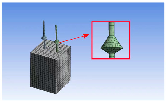 The soil mesh size was identified as a critical factor influencing the simulation’s accuracy. A sensitivity analysis revealed that variations in results became negligible when the element size was smaller than 1200 mm. Therefore, a global soil mesh size of 800 mm was adopted to balance computational accuracy and efficiency. Considering the high stress concentrations, the mesh around the bearing plates was refined to a size of 300 mm. The piles were discretized with a mesh size of 500 mm. Prior to meshing, the model was partitioned along key feature edges to facilitate the generation of hexahedral elements, which are preferred over tetrahedral elements for their superior convergence in nonlinear problems. The final mesh configuration is illustrated in