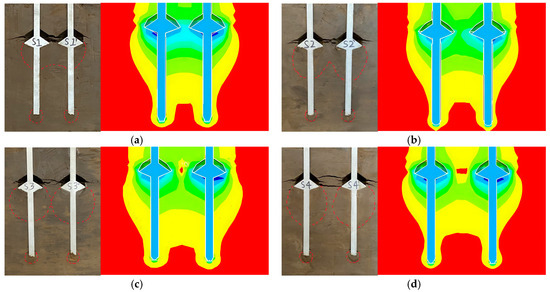 Test phenomenon and displacement cloud. (a) Group ①; (b) Group ②; (c) Group ③; (d) Group ④. Note: The displacement cloud colors represent soil displacement magnitude (e.g., red for large displacement, blue for small displacement), and the red dotted lines indicate soil slip lines.