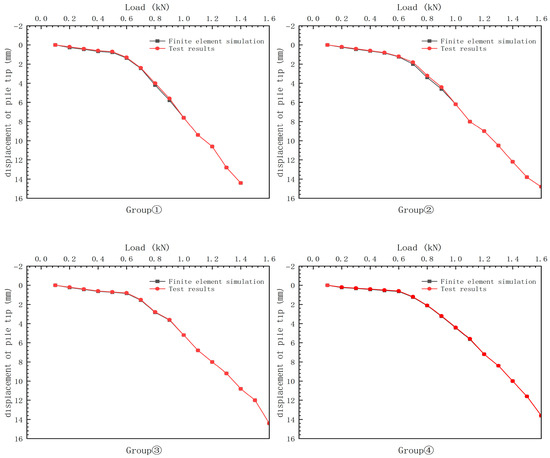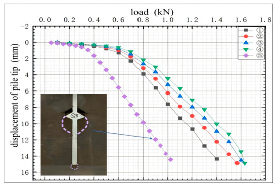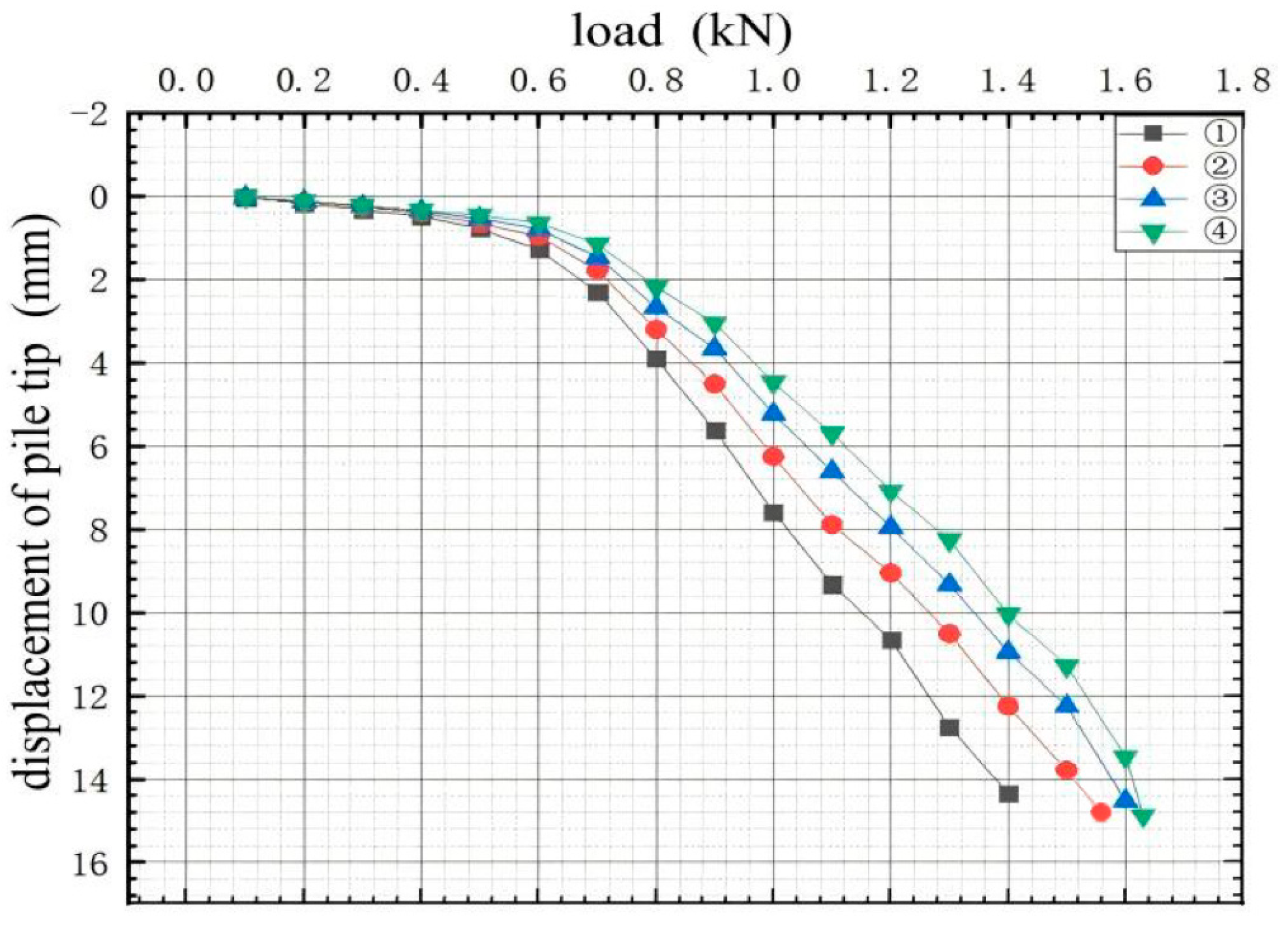 All test groups exhibited similar load–displacement trends. During the initial loading stage (vertical pressure < 0.2 kN), the differences in displacement between the groups were minimal. This is attributed to the limited influence of the pile spacing on the bearing behaviour of the double-pile foundations at this stage, where the foundation capacity was primarily provided by the shaft friction resistance, with the contribution of the bearing plate being relatively small. As the vertical pressure increased, the pile head displacement progressively increased at an accelerating rate. Within the pressure range of 0.2 kN to 0.8 kN, the rate of displacement increase became increasingly divergent between groups, following the sequence: ① > ② > ③ > ④.
