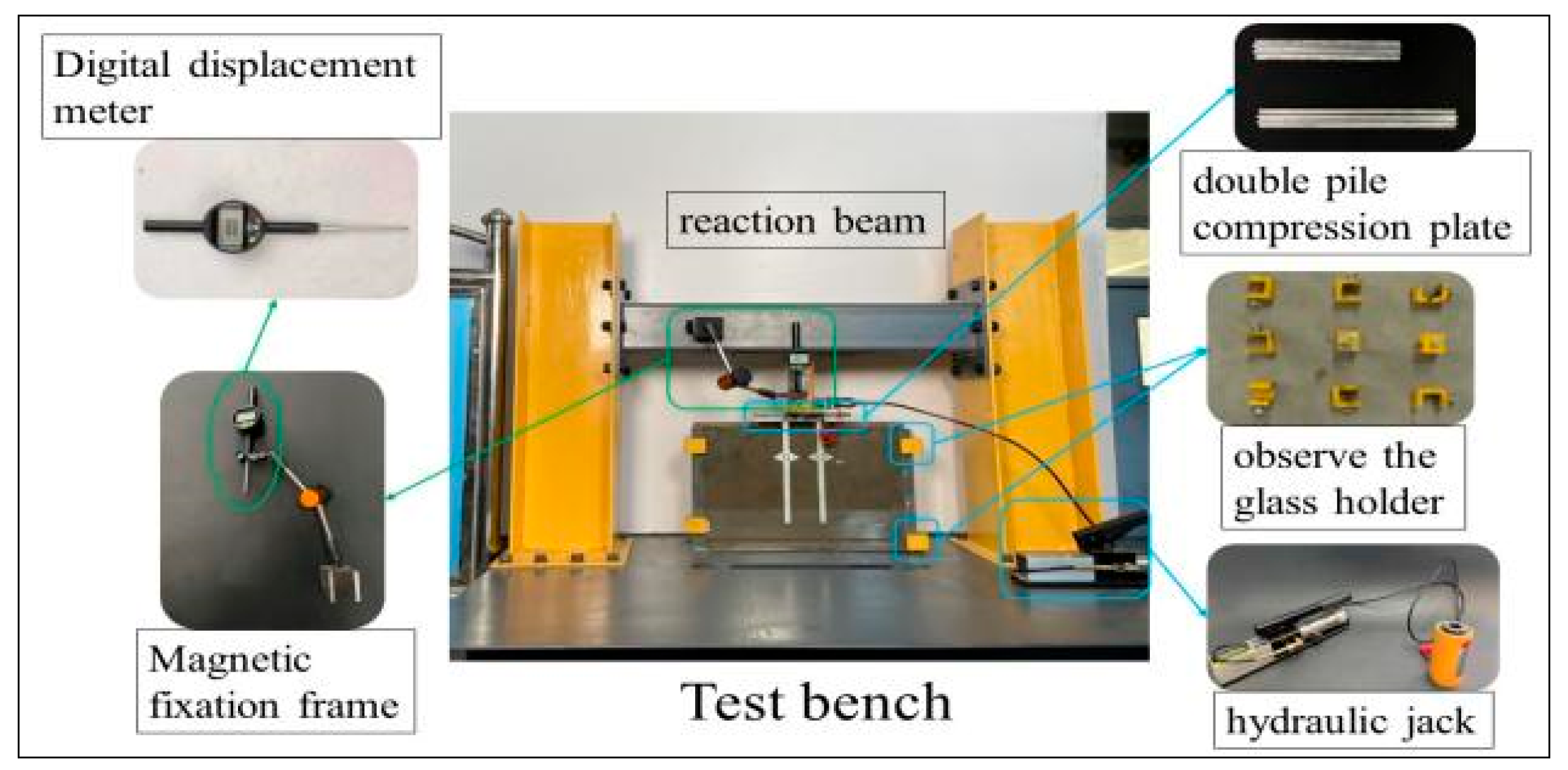 18]. This approach utilises a half-cross-sectional pile model, enabling continuous observation of the failure process in the soil surrounding the pile. This facilitated a clear documentation and analysis of both the deformation evolution of the peripile soil under vertical loading and the ultimate failure patterns of the double-pile foundation system.