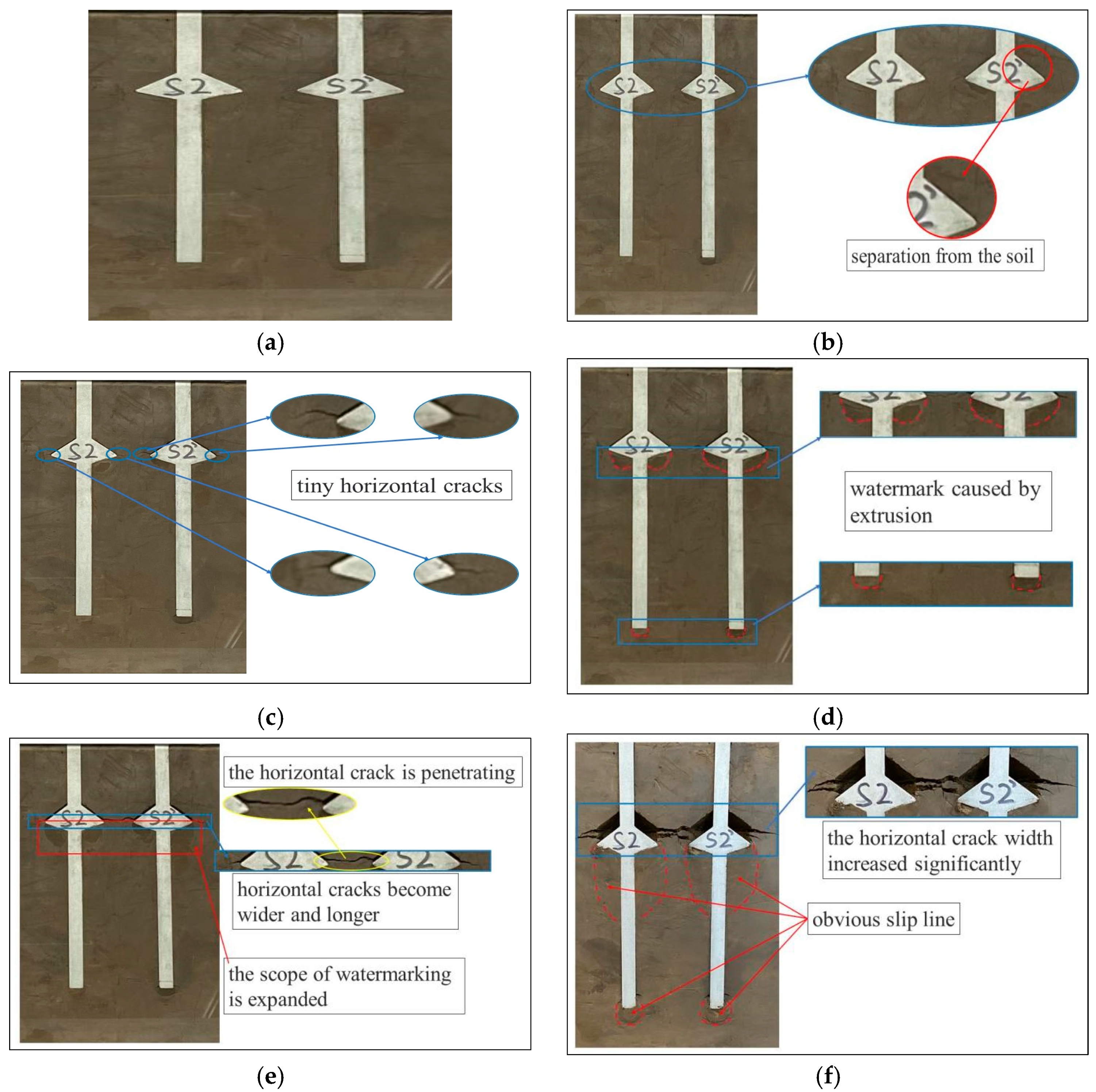 Figure 6d), the soil beneath the plate exhibited noticeable downward movement, and watermarks formed beneath the plate and at the pile toe due to soil extrusion. As the pressure continued to increase, the watermark region expanded, and the length and width of the horizontal cracks increased. At 0.55 kN (