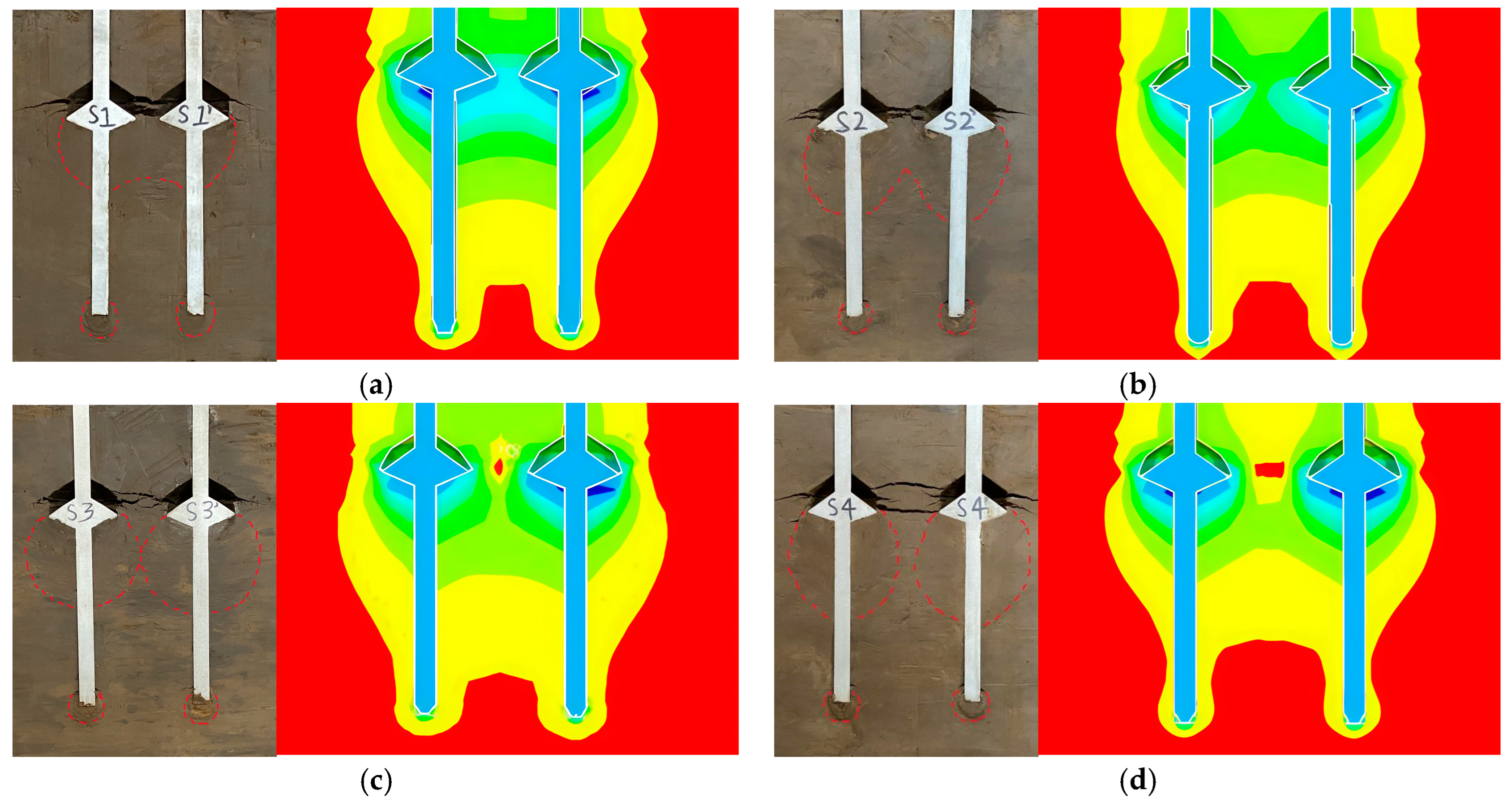 We observed a high degree of consistency between the experimental phenomena and the finite element analysis results. Specifically, the comparison between the soil failure patterns observed in the tests (