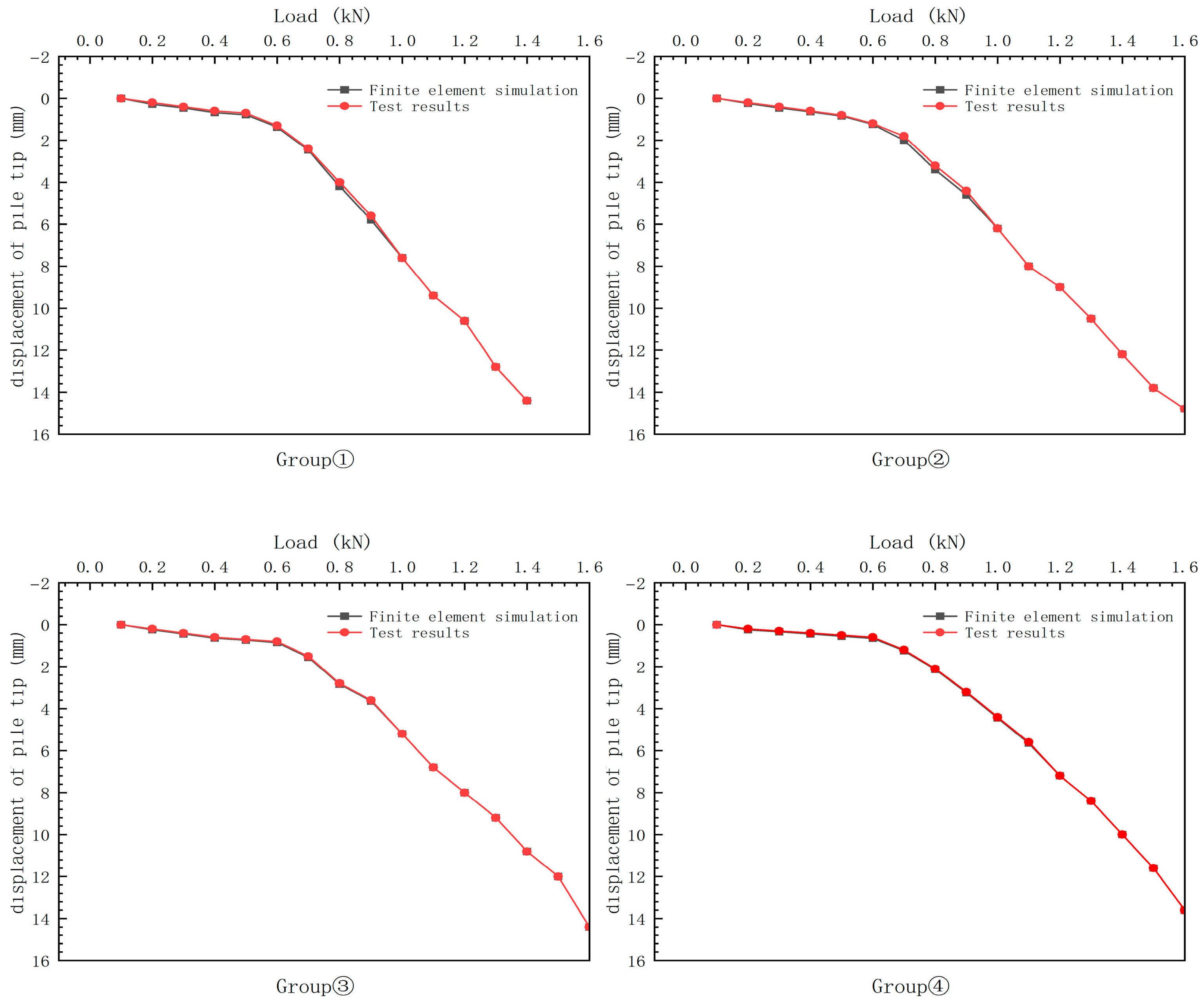 Load–displacement curves from tests vs. finite element (FE) simulations for all pile groups.