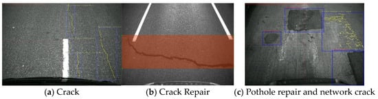 The equipment is primarily capable of efficiently identifying transverse cracks, longitudinal cracks, patch repairs, block cracking, alligator cracking, and potholes, with the recognition results shown in Figure 8. Through comparative testing and manual field inspections of distress, the robustness exceeds 90%, meeting the accuracy requirements for lightweight detection equipment in China. Subsequently, the identified distress in the images is manually reviewed and annotated for secondary data correction.