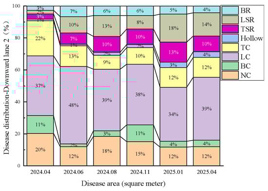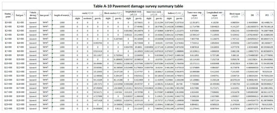 To study the progression of distress over different time periods, various types of distress in the sections mentioned in Section 3.2 were compiled. The statistics of various types of distress in Traffic Lane 2 over different time periods are shown in Table 5 and Table 6.