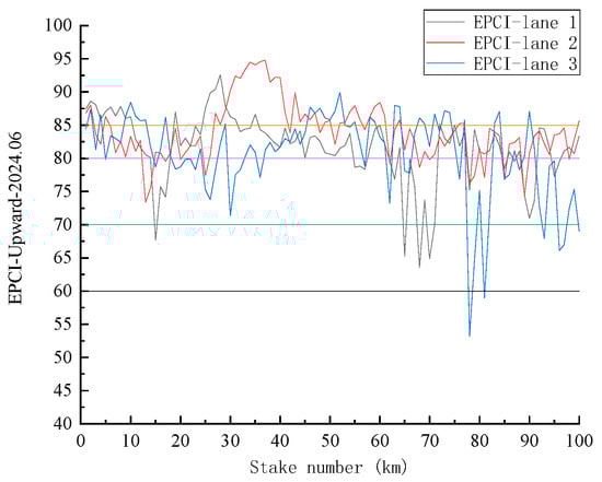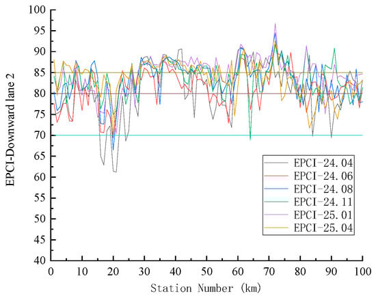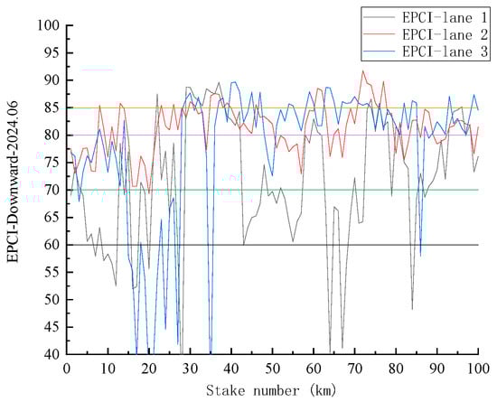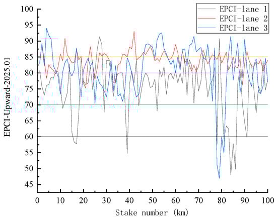 Comparing Figure 10 and Figure 11, as well as Figure 12 and Figure 13, it can be observed that the overall EPCI for the downward lanes is poorer than that for the upward lanes, particularly for Lane 3, which primarily accommodates heavy vehicles. Field surveys indicated that coal transport trucks predominantly travel in the downward direction within Shanxi Province, while the upward direction generally returns empty. Therefore, despite routine maintenance being performed on various road segments, the downward road conditions remain poorer than those of the upward lanes.
