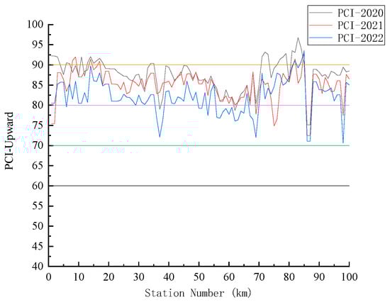 Further data analysis reveals that the differences in upward PCI data between 2020 and 2021 and 2021–2022 are 5 points apart, with percentages of 83% and 75%, respectively. For the downward direction, the corresponding percentages are 73% and 77%. The average PCI deterioration for 100 km in the upward direction is 2.42 points and 2.84 points for the two periods, while in the downward direction, it is 4.73 points and 1.73 points. This suggests that the extended time interval and minimal maintenance efforts provide a viable basis for studying the development of pavement distress. It is also recommended to focus on segments with an EPCI difference in more than 5 points and to enhance maintenance efforts to maintain a good service level for the pavement.