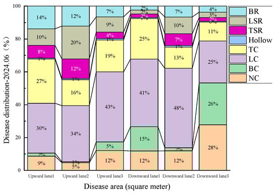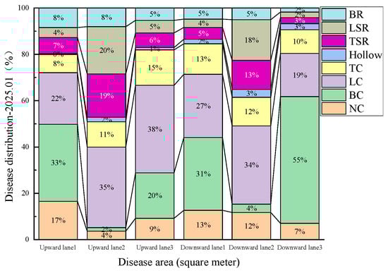 Based on the traffic volume data, it can be observed that the number of distress in Lane 1 is not significantly different from that in Lane 3 due to the particularly large number of small and medium-sized passenger vehicles. For analytical convenience, the distribution chart of distress proportions has been summarized in Figure 18 and Figure 19. Referring to Table 3 and the data in Figure 18, it is found that in June 2024, the total area of distress in the upward direction reached 19,279.8 m2, primarily consisting of longitudinal and transverse cracks, which accounted for 57.21% of the total disease area. The proportion of network cracks was relatively low at 11.77% of the total disease area. In the downward direction, the total area of distress was 45,111.3 m2, with longitudinal and transverse cracks comprising 54.94% of the total disease area, while network cracks had a relatively high proportion of 34.04% of the total disease area. Referring to Table 4 and the data in Figure 19, it is noted that in January 2025, the total area of distress in the upward direction reached 26,761 m2, mainly consisting of longitudinal and transverse cracks, which accounted for 38.9% of the total disease area. The proportion of network cracks was relatively low at 36.6% of the total disease area. In the downward direction, the total area of distress was 37,015.1 m2, with network cracks making up 48.38% of the total disease area, while longitudinal and transverse cracks also had a relatively high proportion of 36.05% of the total disease area.