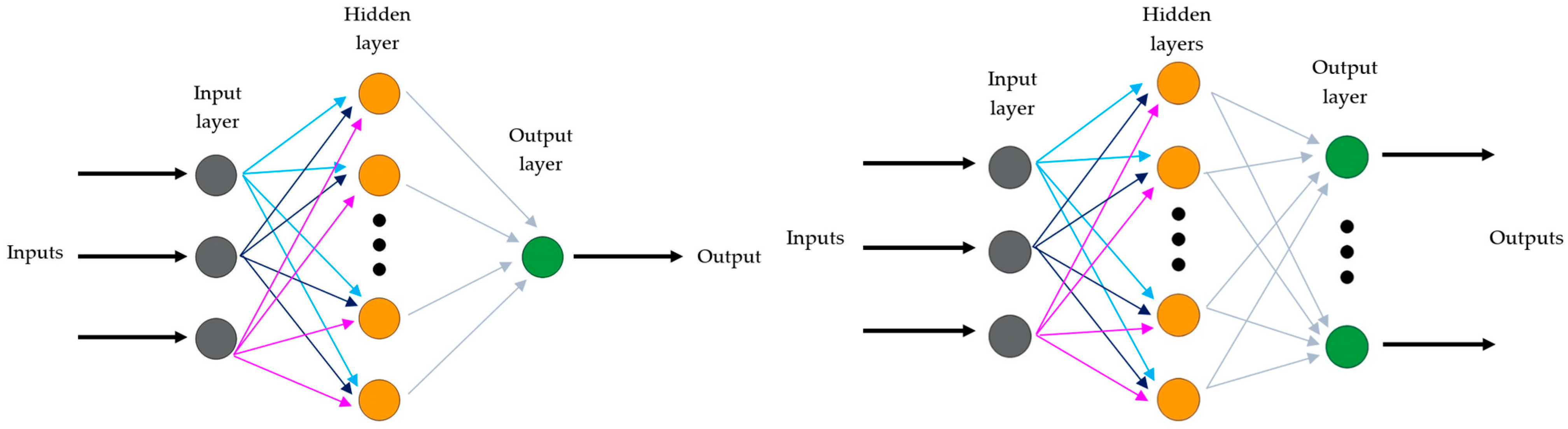- A neural network with multiple outputs offers the advantage of capturing relationships among different target variables within a single model. This approach can reduce training time and help maintain consistency in predictions, especially when the outputs are correlated and sufficient data is available for all targets. However, networks with multiple outputs can be more challenging to train because the model must balance the learning process across all outputs. Poor quality of the observed behaviour in one output may negatively affect others. In contrast, single-output networks are simpler to design and optimise since they focus on one target at a time, but they require separate models for each variable and do not exploit potential correlations between outputs.