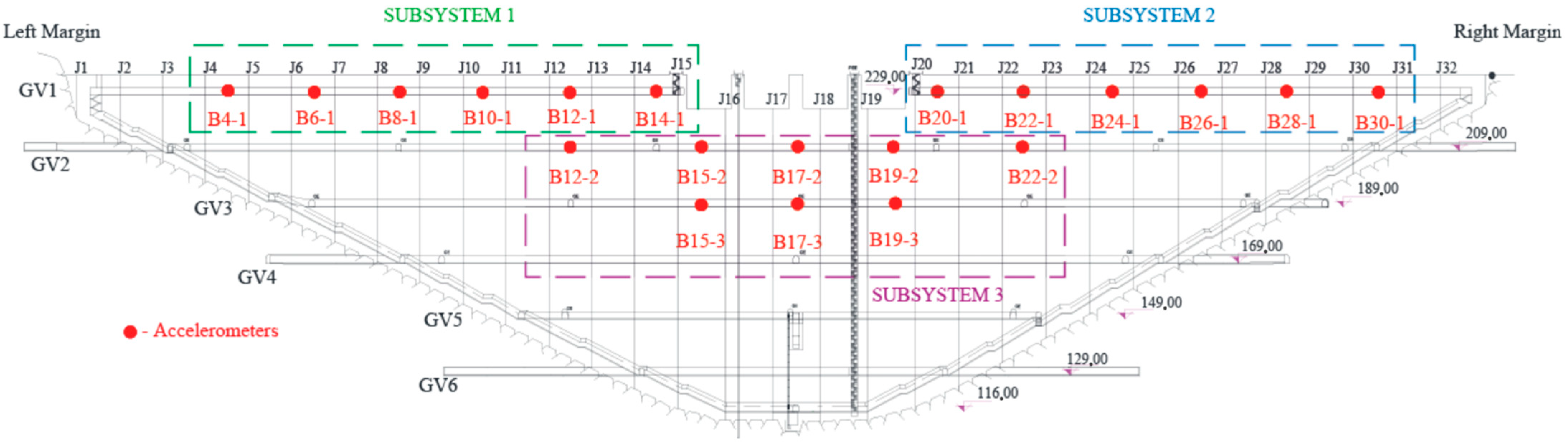- Pereira, S.; Magalhães, F.; Gomes, J.; Cunha, Á.; Lemos, J. Dynamic monitoring of a concrete arch dam during the first filling of the reservoir. Eng. Struct. 2018, 174, 548–560. [Google Scholar] [CrossRef]