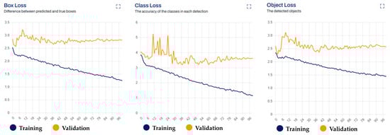 Necessity for this operation arose from the requirement to automate and simplify the workflow between the two environments, whilst ensuring the protection of data. The YOLO model was trained for 100 epochs, at the conclusion of which graphical visualisations were produced that document the performance of the evaluation metrics, such as the loss function, precision, recall value and accuracy, monitored during the training process (see Figure 5 and Figure 6). During the training phase of the object detection model, several performance metrics calculated on the validation set were monitored, in order to evaluate the generalisation capacity of the network. Figure 4 shows the evolution of the box loss, i.e., the error between the bounding boxes predicted by the model and the actual ones, during the training epochs. A progressive decrease in the loss is observed on the training data, a sign that the model is learning the relationships present in the data. However, the loss on the validation data remains almost constant throughout the training period, suggesting overfitting.