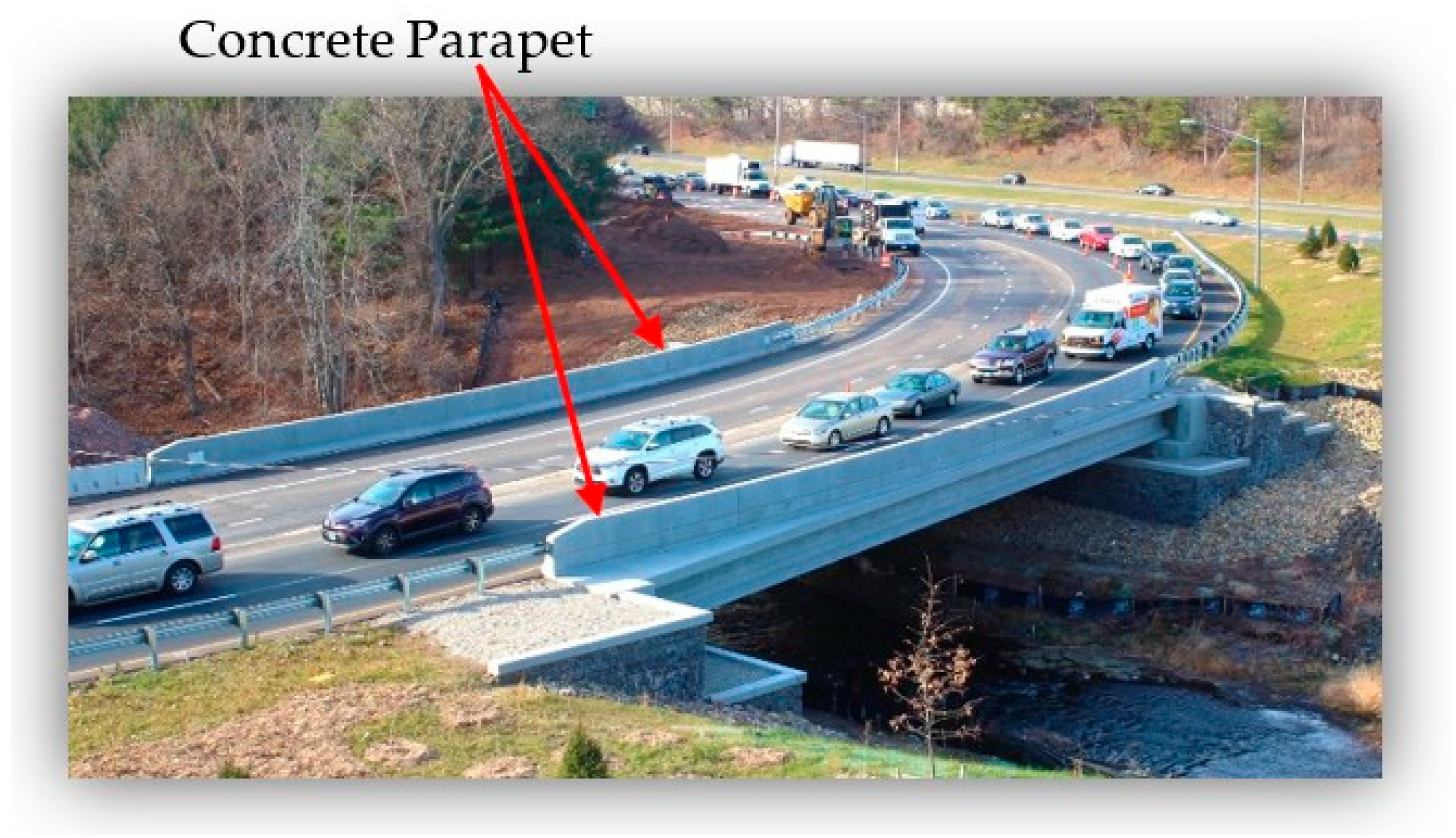 - Connecticut Department of Transportation. Bridge Design Standard Practice for Parapet and Railing Design on Bridges and Retaining Walls; Engineering Directive ED-2020-1; Connecticut Department of Transportation: Newington, CT, USA, 2020.