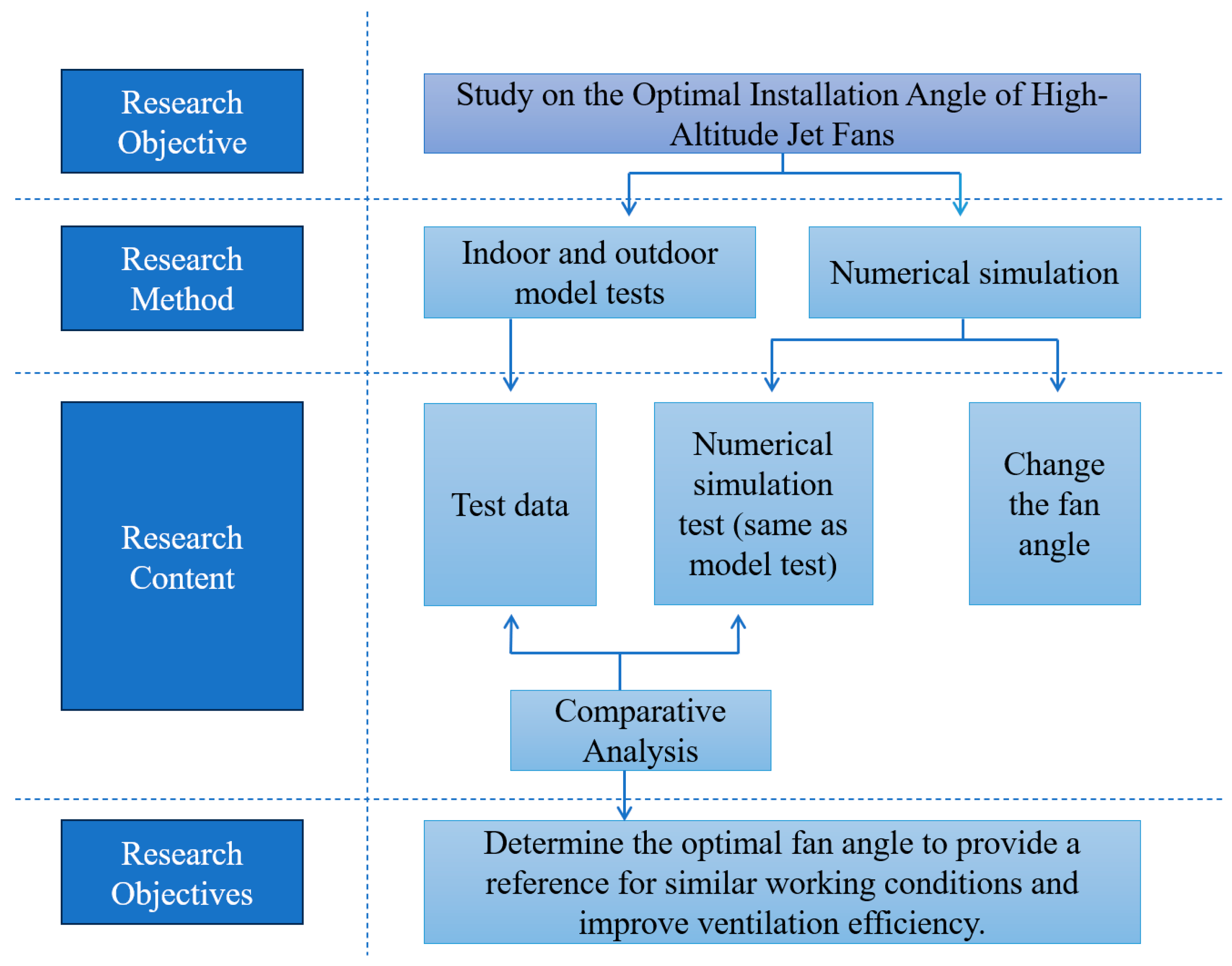 In highway tunnels, the design and operation of ventilation systems are critical for ensuring air quality and traffic safety. This challenge becomes particularly pronounced in high-altitude regions, where environmental factors such as thinner air and lower atmospheric pressure exacerbate efficiency and energy consumption issues in ventilation systems. As a core component of longitudinal tunnel ventilation systems, the performance of jet fans directly determines the overall effectiveness of these systems. However, in practical applications, the efficiency of jet fans is often constrained by multiple factors, among which the installation tilt angle of the fans emerges as a critical influencing parameter.