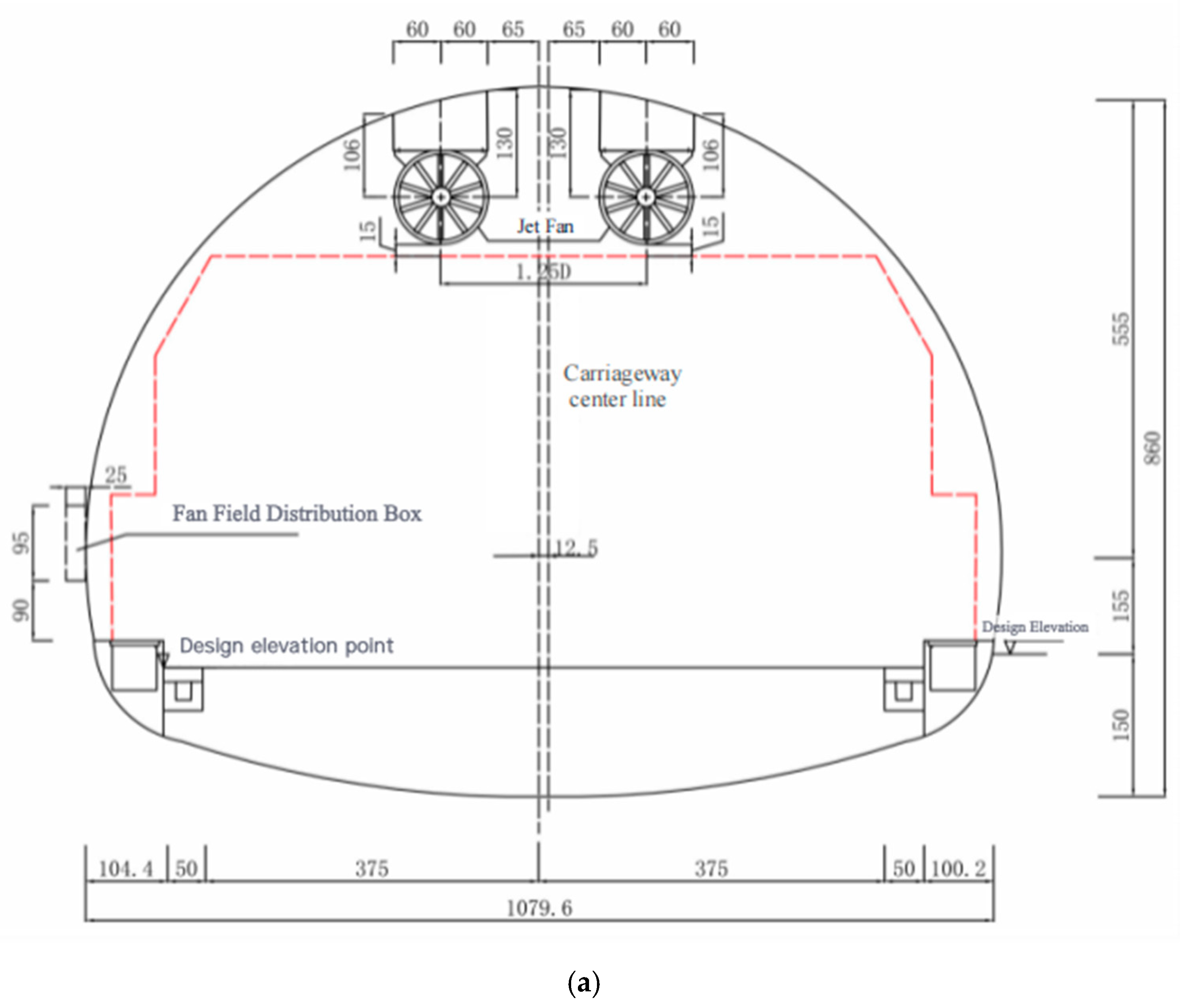 In this study, a set of two Type 1120 fans was installed in the tunnel for investigation. The fan impeller diameter is 1120 mm, and it is a two-way jet fan (reversible), which is widely used in ventilation systems such as highway tunnels, railway tunnels, and subways in China. With specific arrangement parameters as follows: positioned 100 m from the tunnel entrance, maintaining a transverse clearance of 1.25 D (where D represents the fan diameter), and spaced 0.15 m from the structural clearance boundary.