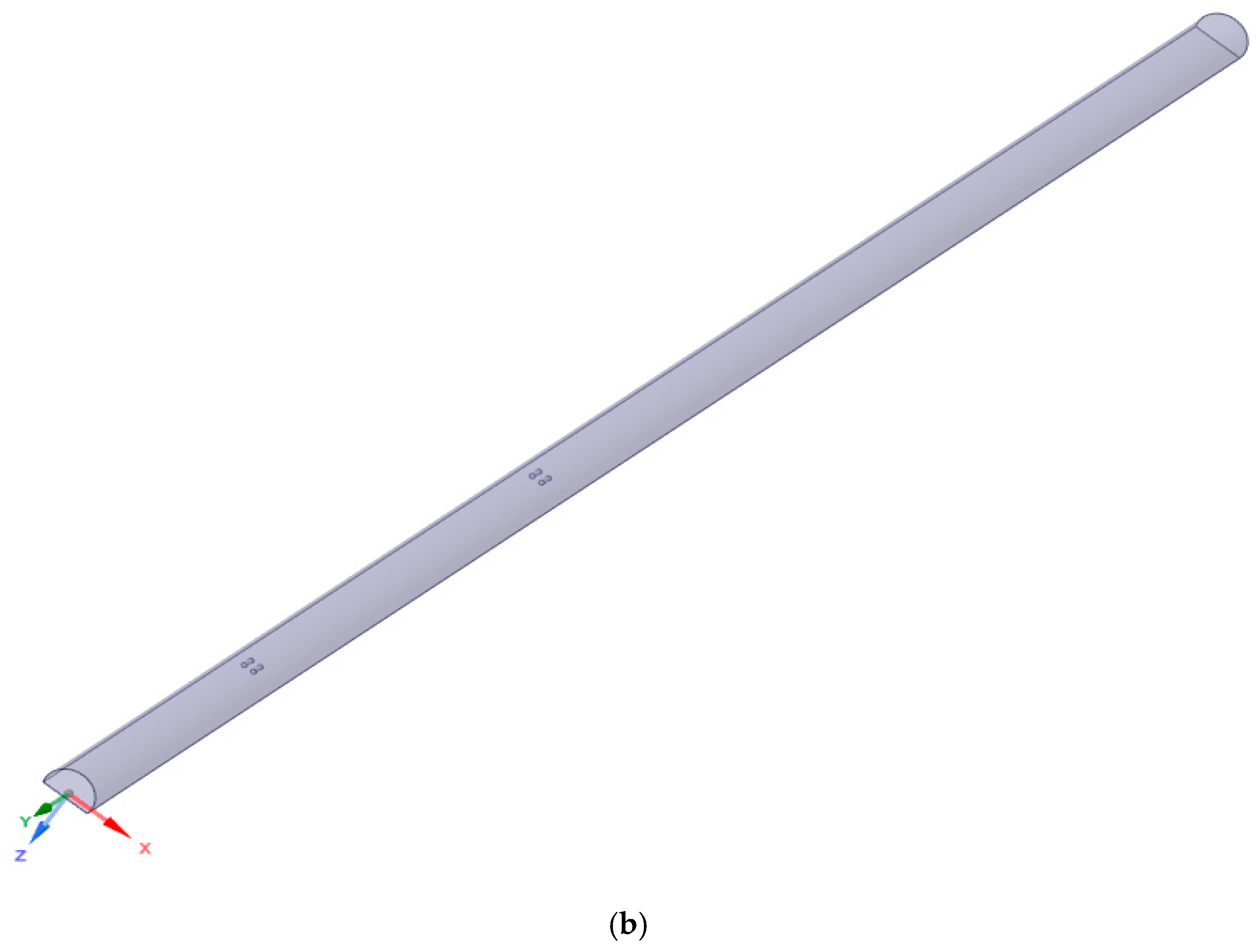 The present study employs the reformulated RNG k-ε variant of eddy-viscosity models, which demonstrates enhanced capability in handling strong swirling flows, curved wall boundaries, and streamline curvature effects prevalent in engineering computations. This turbulence closure scheme provides superior predictive accuracy for confined aerodynamic configurations characteristic of tunnel environments. The governing equations are formulated as follows: turbulent kinetic energy k transport, Equation (1); turbulent dissipation rate ε, Equation (2); and turbulent viscosity, Formula (3), as per Wang et al. [