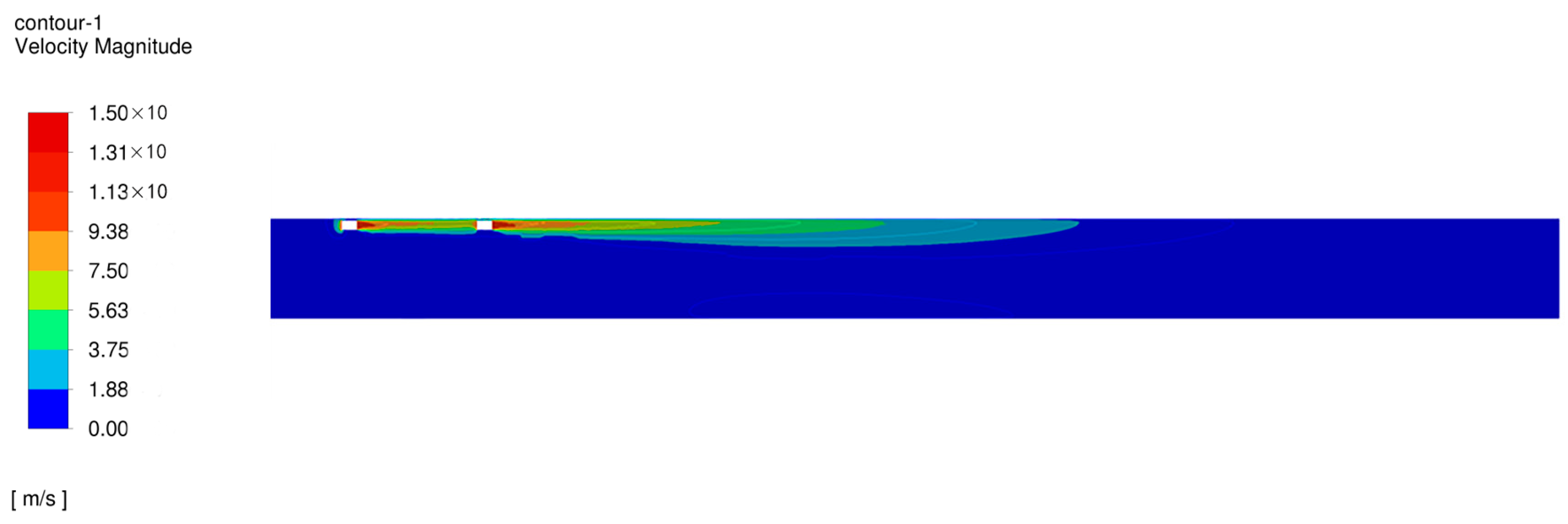 Figure 15 further elucidates the impact of fan tilt angles on high-velocity airflow distribution within the tunnel. When horizontally positioned, the fan exhibits stable development of high-velocity airflow, with an extended influence range predominantly in the upper tunnel section. However, as the fan tilts downward, the airflow becomes progressively confined between the tunnel ceiling and floor, resulting in a gradual reduction in its affected area. Notably, within tilt angles ranging from 0° to 4°, the fan’s influence range demonstrates an unexpected expansion, which might be attributed to enhanced airflow uniformity along the tunnel cross-section and diminished frictional losses. However, as the tilt angle further increases from 4° to 10°, a progressive reduction in the fan’s effective coverage is observed. At tilt angles of 3° and 5°, the lift forces reached 19.36 Pa and 19.55 Pa, respectively, both closely approximating the value observed at the 4° tilt angle. Particularly at a 10° tilt angle, premature collision of high-velocity airflow with the tunnel floor occurs prior to flow stabilization, resulting in a substantial loss of kinetic energy that ultimately diminishes the fan’s overall operational impact within the tunnel. This energy dissipation not only compromises airflow propulsion efficiency but also potentially elevates energy consumption and maintenance requirements. A study by Gao et al. [