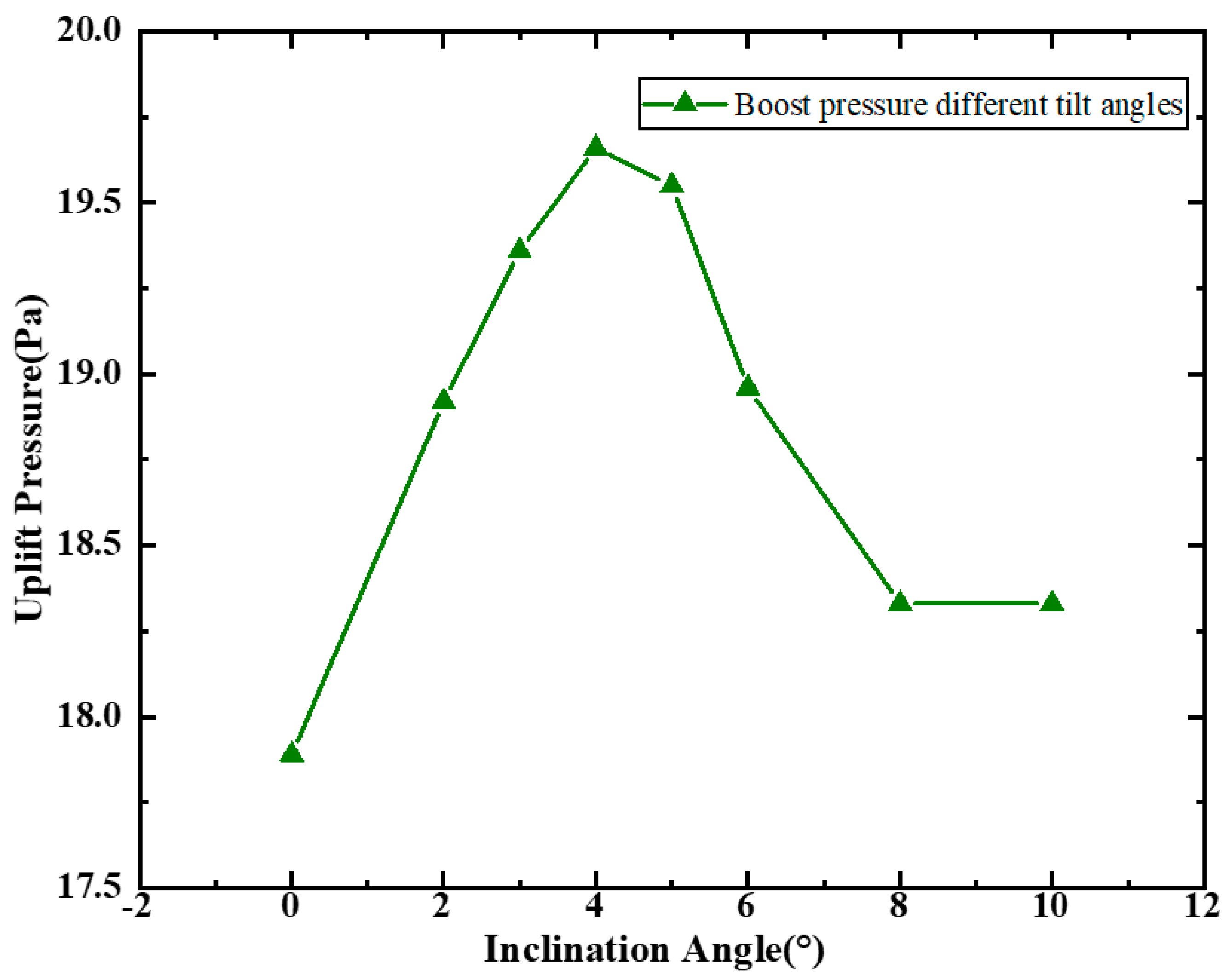 Figure 10, aerodynamic performance exhibits significant angular dependence. Notably, within the 0–4° tilt angle range, the lift coefficient demonstrates a consistent upward trend with increasing installation angles. This aerodynamic enhancement can be attributed to the progressive reduction in high-velocity airflow contact area with tunnel walls under elevated tilt configurations. The diminished wall interaction effectively reduces frictional resistance forces, thereby improving longitudinal airflow propulsion efficiency.