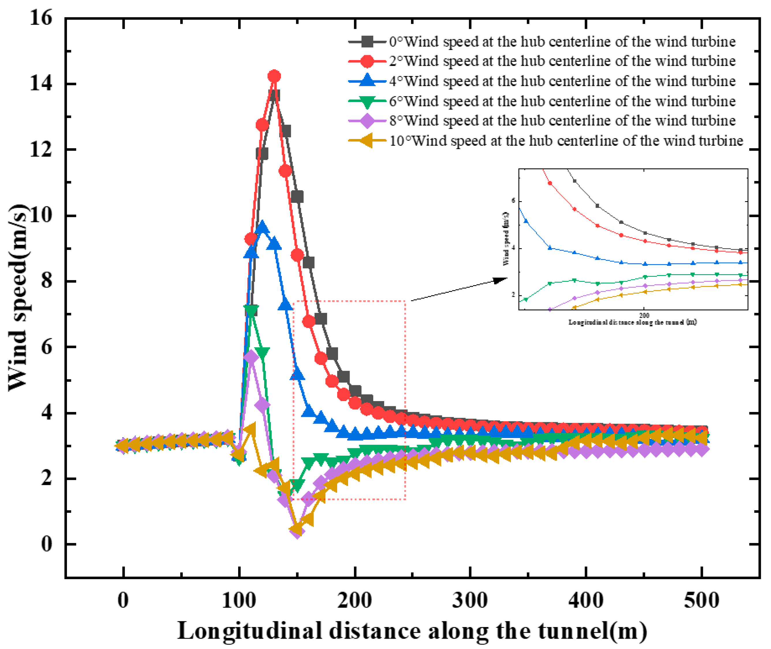 Figure 14, airflow velocity demonstrates progressive attenuation along the longitudinal tunnel distance at installation angles of 0°, 2°, and 4°. Conversely, configurations with 6°, 8°, and 10° tilt angles exhibit a distinctive triphasic evolution pattern: an initial acceleration phase, a subsequent decay segment, and a terminal gradual recovery stage. The velocity profile manifests sequential augmentation, reduction, and eventual mild resurgence with increasing longitudinal distance, ultimately converging to comparable terminal values across all configurations at the tunnel exit region. This phenomenon reveals two critical aerodynamic mechanisms. First, although initial thrust generation varies significantly across different installation angles, such differential effects undergo progressive attenuation during airflow propagation through the tunnel, culminating in velocity homogenization at the exit plane. Comparative analysis of peak velocities between 0°/2° configurations and larger angles demonstrates an inverse relationship between installation angle magnitude and maximum airflow velocity. Notably, at the 150 m monitoring station, configurations with 6°, 8°, and 10° tilt angles exhibit velocity minima, suggesting that larger installation angles (≥6°) initiate flow separation and enhance turbulent kinetic energy production. These coupled mechanisms exert dual inhibitory effects on both airflow distribution uniformity and propulsion efficiency. The angular dependency of these aerodynamic behaviors is fundamentally rooted in the restructuring of momentum transfer mechanisms induced by blade angle variations, and modified pressure gradient distributions that alter energy conversion pathways within the flow field.