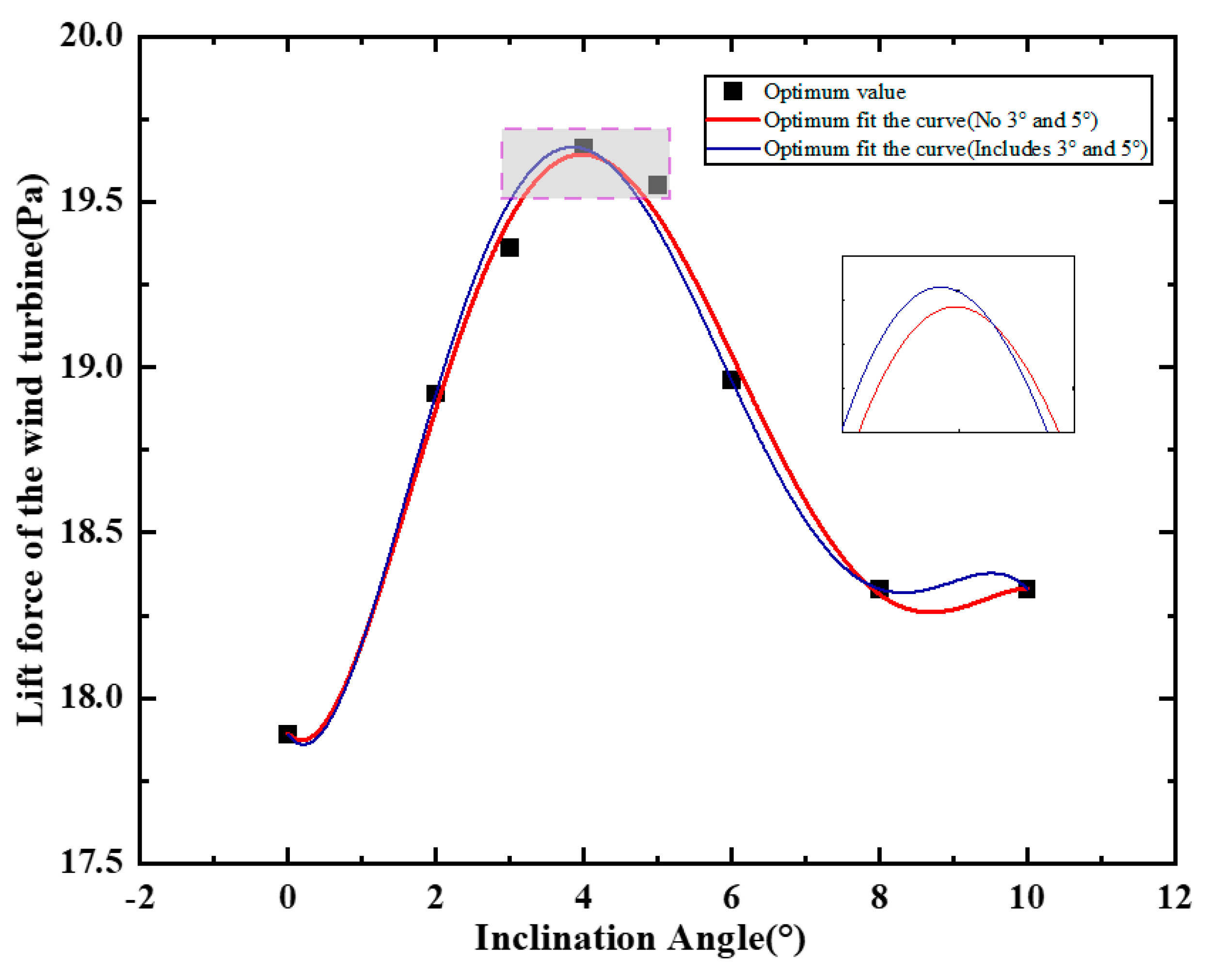 Figure 16 shows the comparison between the fitted formula data and calculated values of fan lift pressure under various tilt angles. The figure demonstrates that this formula can accurately characterize the variation trend of fan lift pressure at different tilt angles, providing valuable insights for relevant engineering applications.