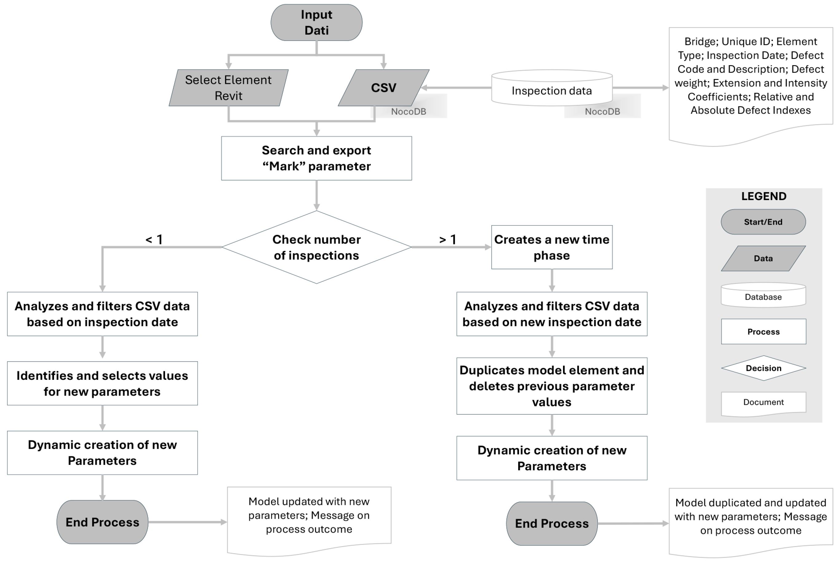 The automated process is based on assigning each element of the model a unique identification code (“Mark”), which allows matching with the information contained in the database. Starting from this unique key, the graphs analyze the data exported in CSV format from the NocoDB database, which collects the bridge defect reports, and associate them with the corresponding elements of the model. The entire information verification and updating process is based on graphs structured in several phases and adapted to different cases, including the presence of a single inspection or multiple inspections for the same element.
