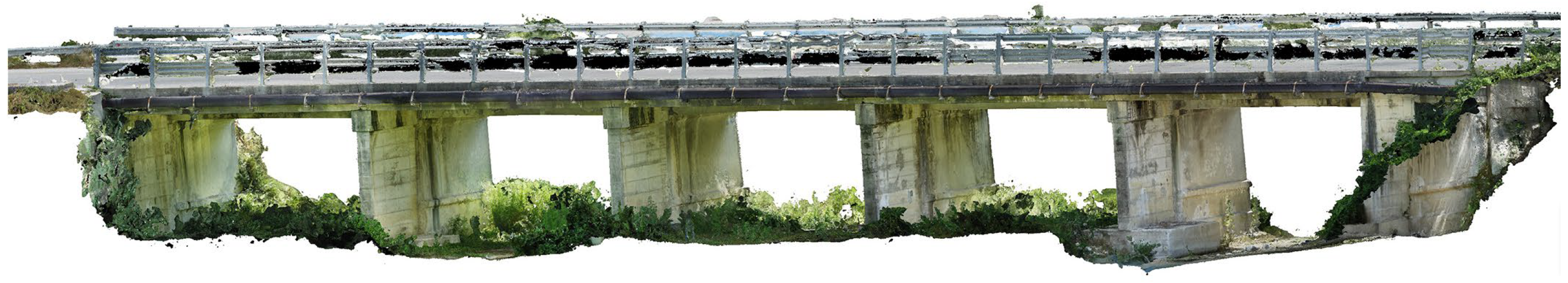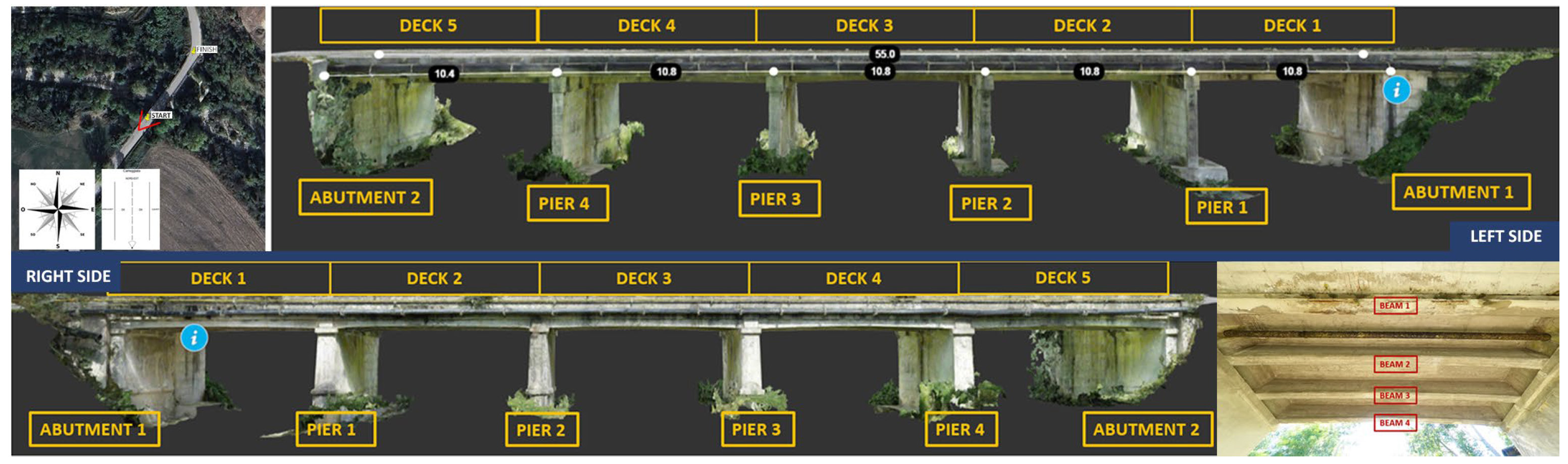 For the test bridge, the workflow was applied experimentally by adopting an inspection approach based on the digital survey output to ensure sufficient accuracy for a reliable assessment of defect characterization. Indeed, the integration of diverse data, such as point clouds and high-resolution images, allows cross-validation of information, thus improving the overall reliability of inspection.
