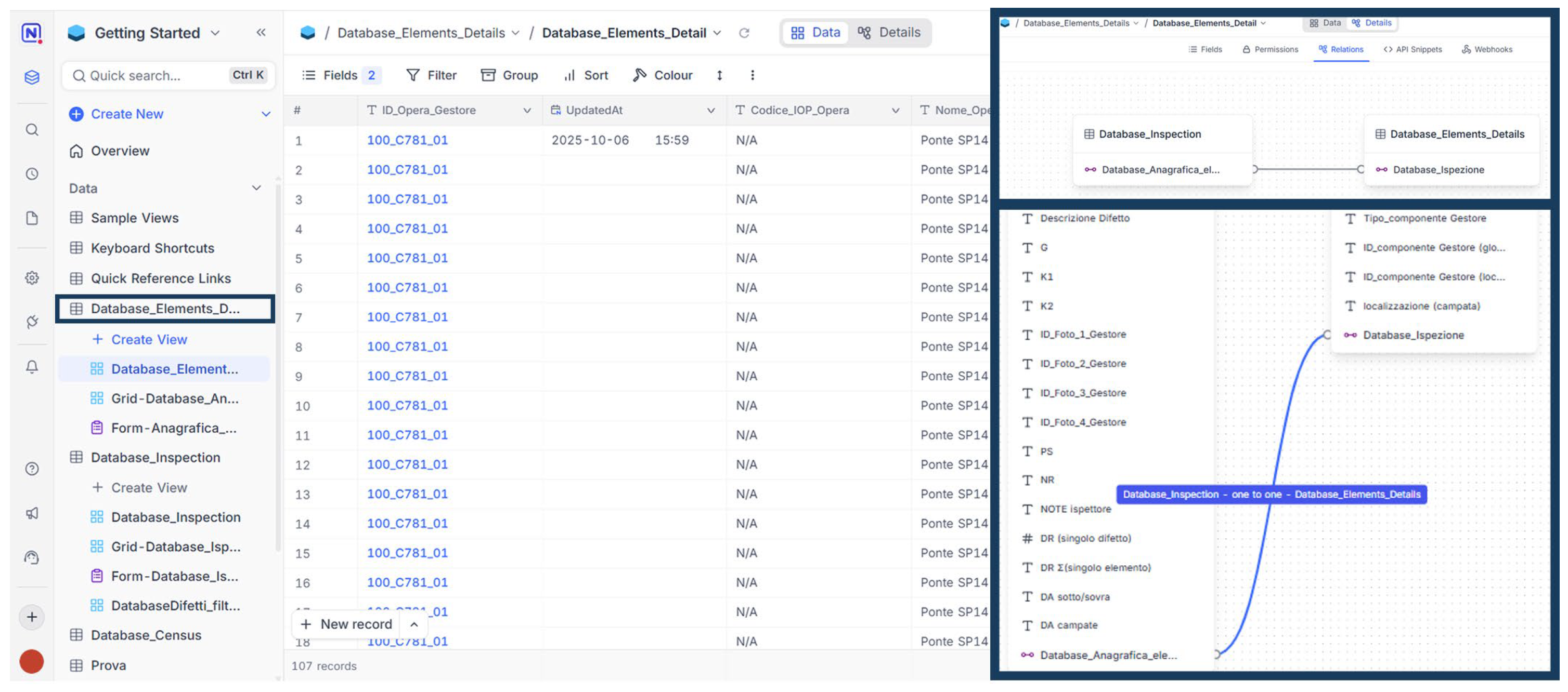 As part of the digitization and information management process for data collected during the census, survey, and inspection of assets, a relational database was developed using the open-source NocoDB platform. The system was structured to normalize information in compliance with national standards and organized into three main tables, consistent with the forms defined in the MIT Guidelines: Element Details Form, Inspection Form, and Census Form. These three tables (