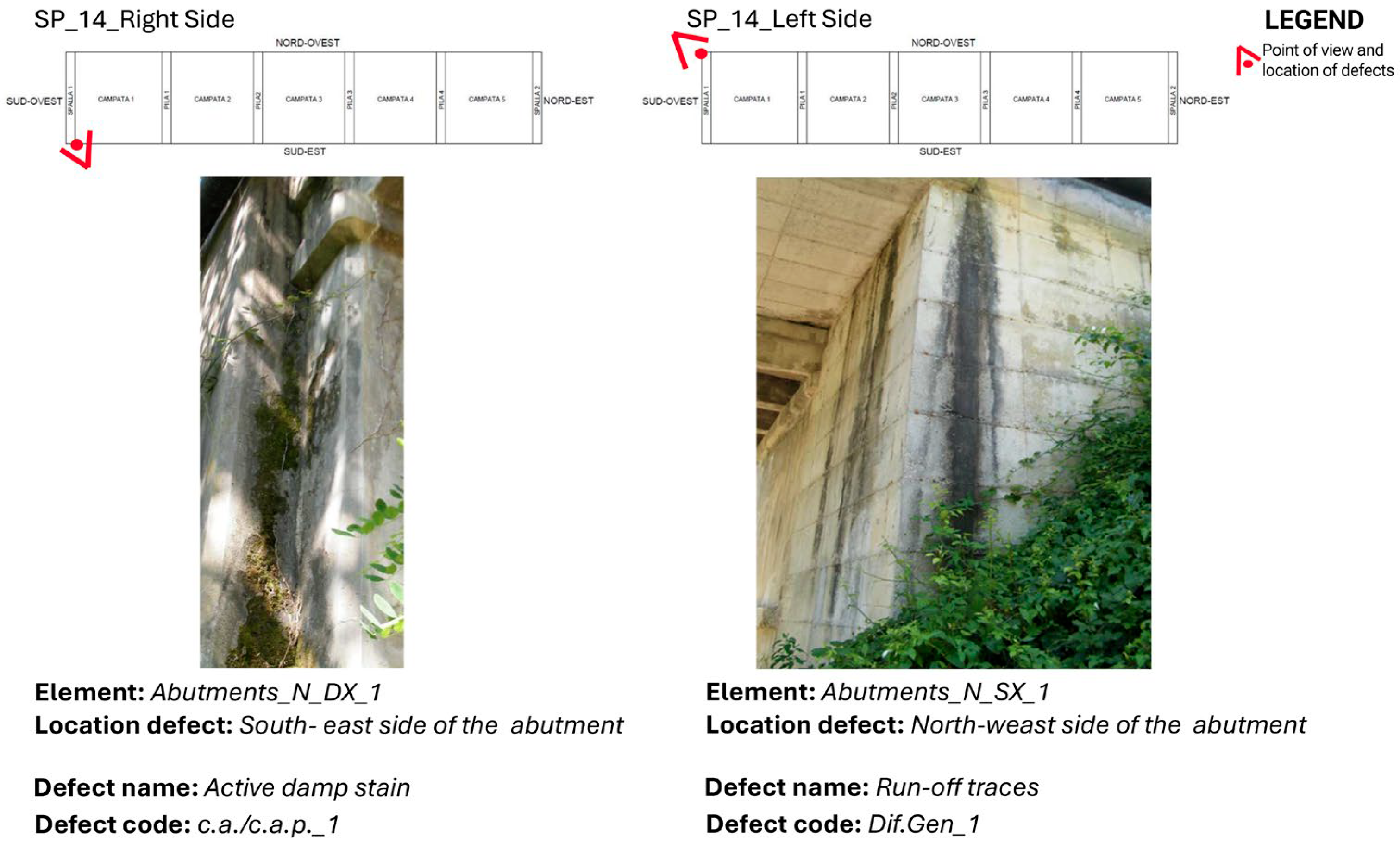 The high-resolution images obtained by drone and reflex camera were used to visually identify and characterize surface defects, in particular moisture stains, runoff phenomena, concrete spalling, localized erosion, and cracks (