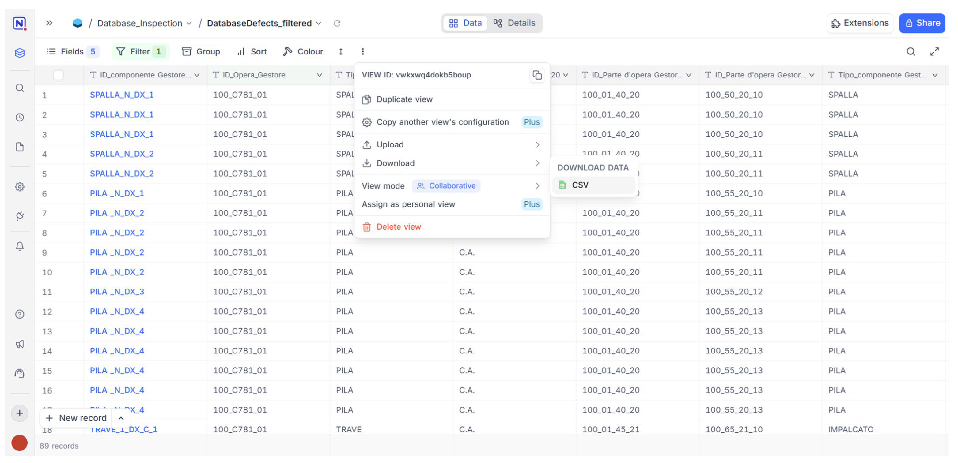 Once the inspection phase was complete and the inspection form had been filled in, the grid view was filtered to extract a selected subset of relevant data fields for exporting to CSV (