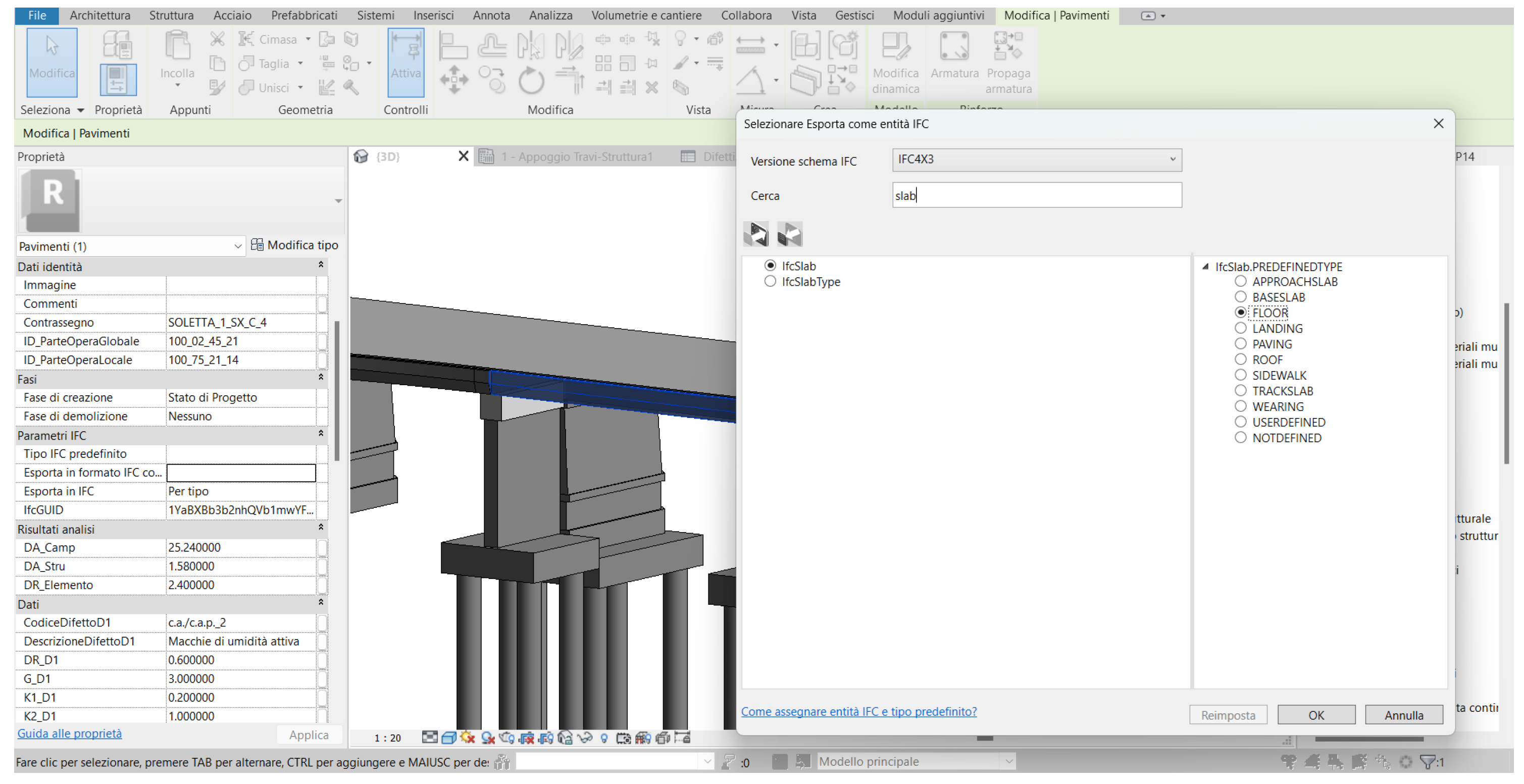 The parametric modeling of the test bridge was carried out starting from a critical review of the available technical documentation, combined with the data collected during the survey phase and the completion of the inspection forms. This enabled the analysis and understanding of the main characteristics of the structural components, which were then semantically decomposed and modeled, highlighting the geometric and structural relationships between the different elements.
