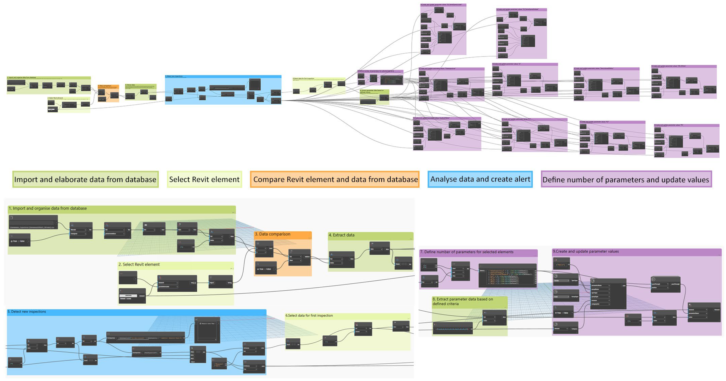 The second graph, on the other hand, is designed to process cases with multiple inspections and can be activated when the first graph generates an alert during the inspection date check. At the development stage described herein, a new project phase corresponding to the inspection date must be manually created prior to execution and provided as an input to the Dynamo routine. Once the new phase is selected, a Python code duplicates the selected element and removes any values associated with the information parameters from previous inspections, automatically updating them with the new information retrieved from the database records.