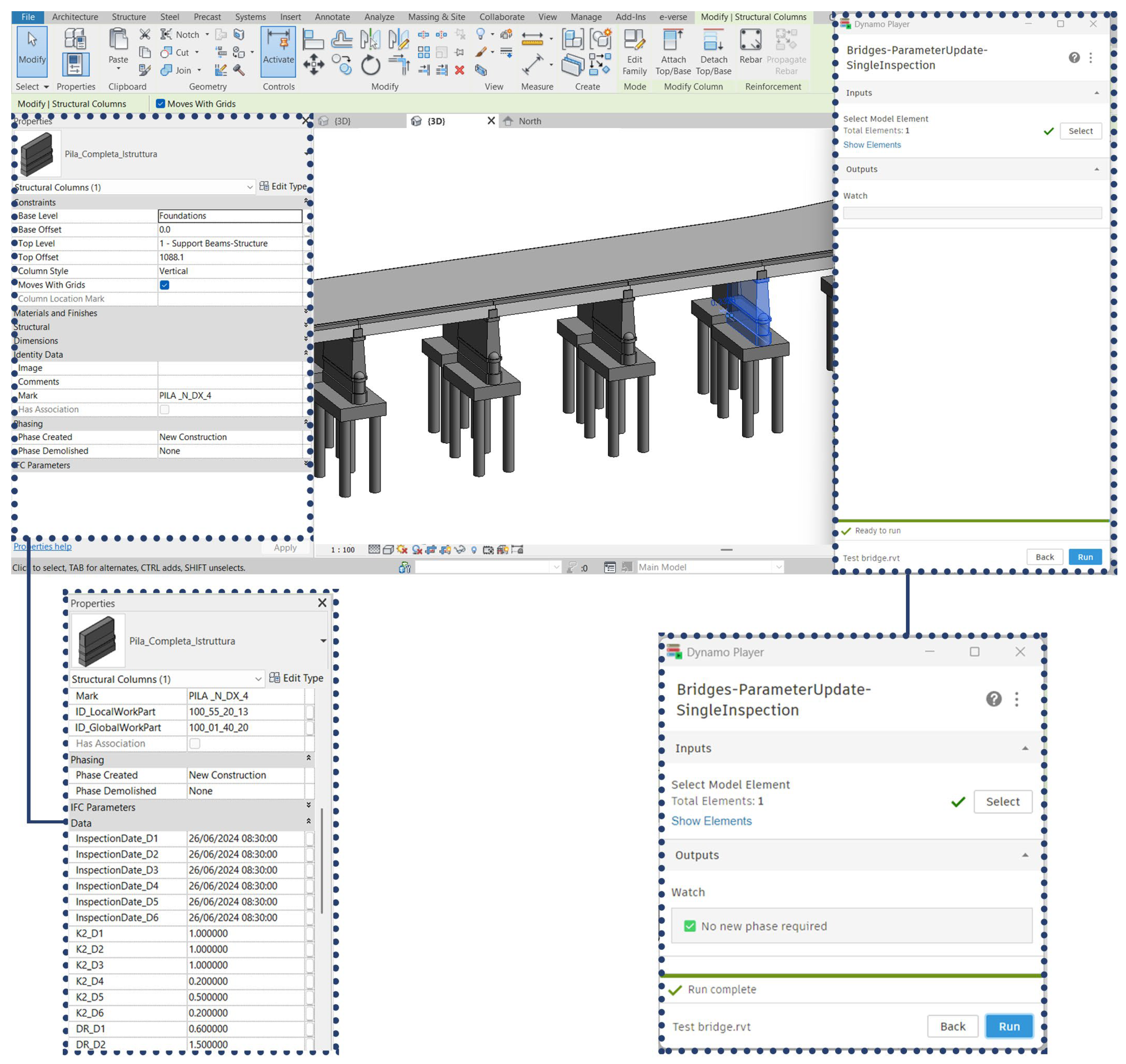 The graphs achieve a high level of automation. Once the manual selection of a model element or a new time phase is made, operations such as filtering, data duplication, element creation, and parameter compilation are performed automatically, reducing errors caused by manual input and cutting the time needed to create, verify, and update parameters by around 70%. The proposed workflow preserves the history of inspection activities and records information acquired in new campaigns, thus enabling the monitoring of bridge conditions over time. In addition, the modular structure of the code allows the workflow to be adapted for other models or types of infrastructure and, with minor modifications, to be applied in international contexts.