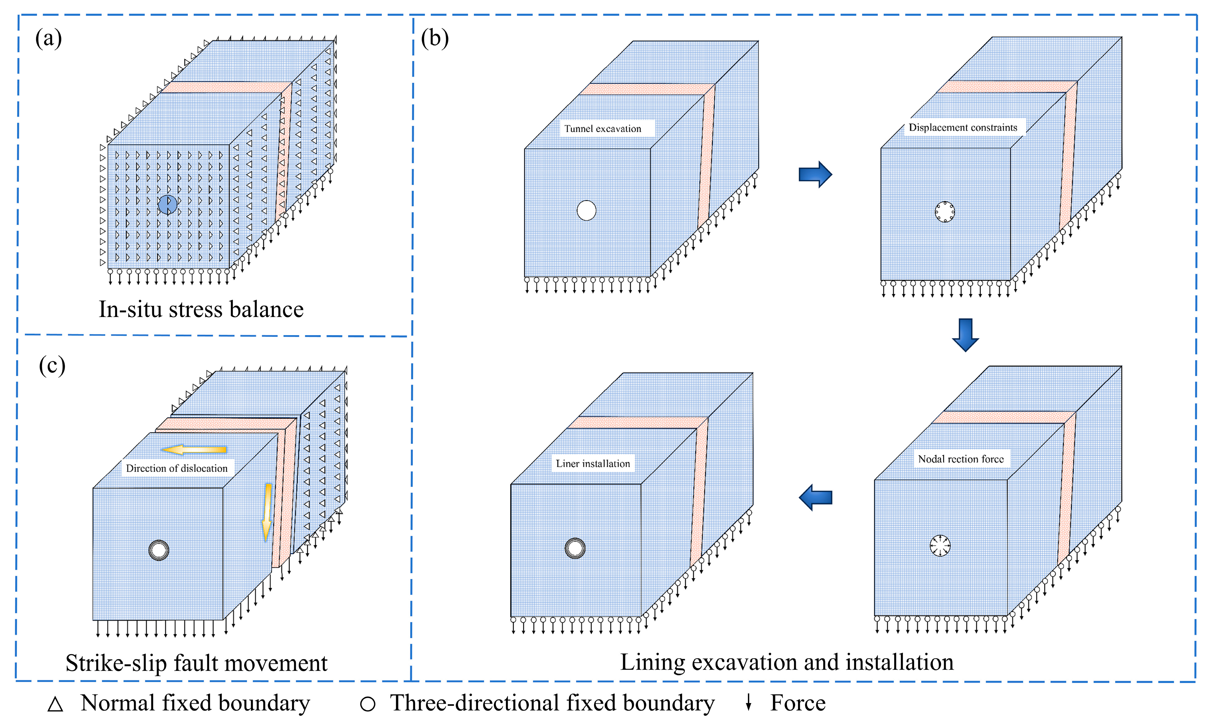 - Zhang, N.; Zhou, H.; Gao, Y.; Zhu, Y.; Lu, J.; Zhao, C.; Cheng, G. Deformation and failure mechanism of deep-buried tunnel under the action of fault dislocation and application of nonlocal model in numerical simulation research. Eng. Fail. Anal. 2025, 174, 109496. [Google Scholar] [CrossRef]