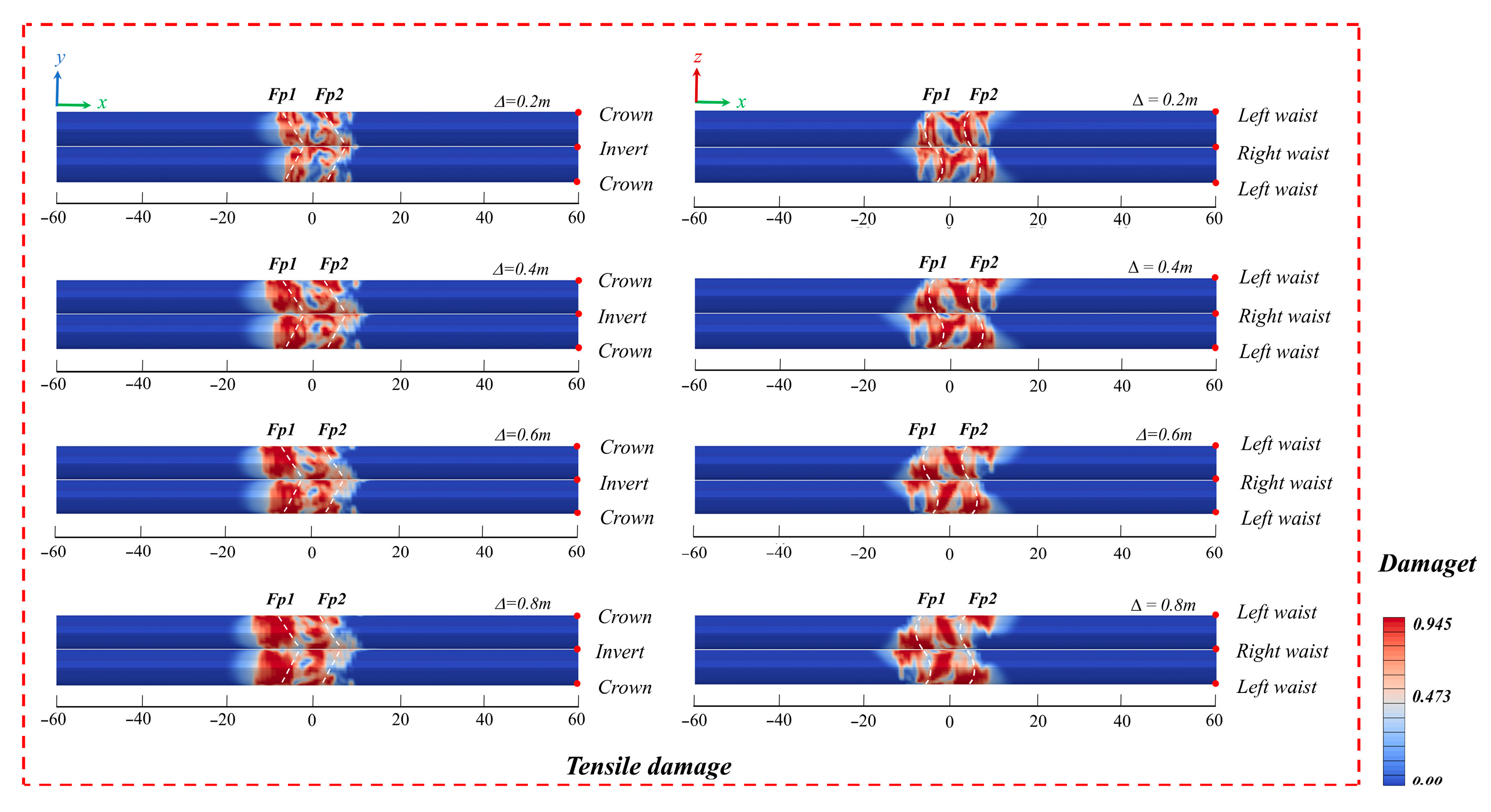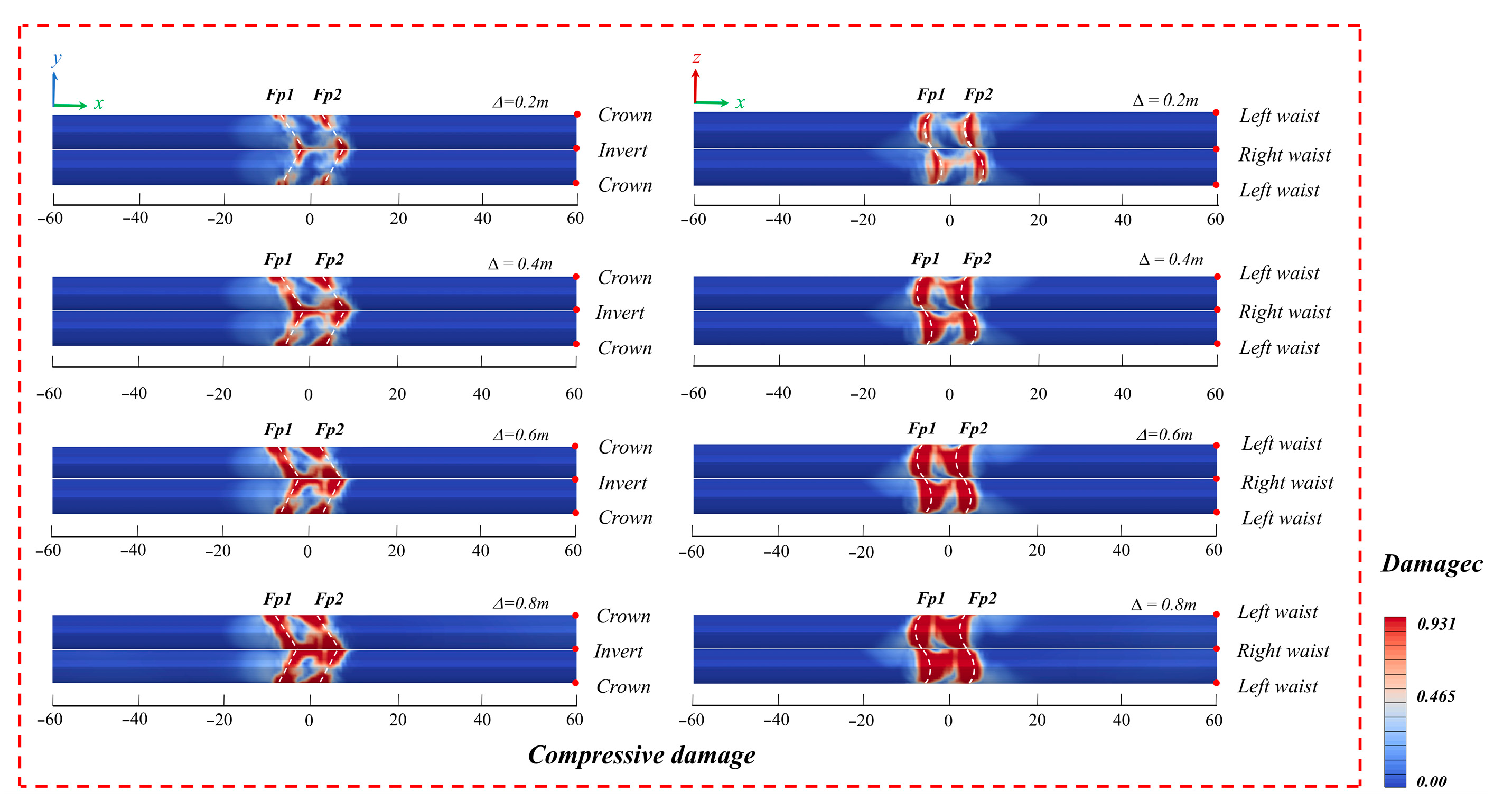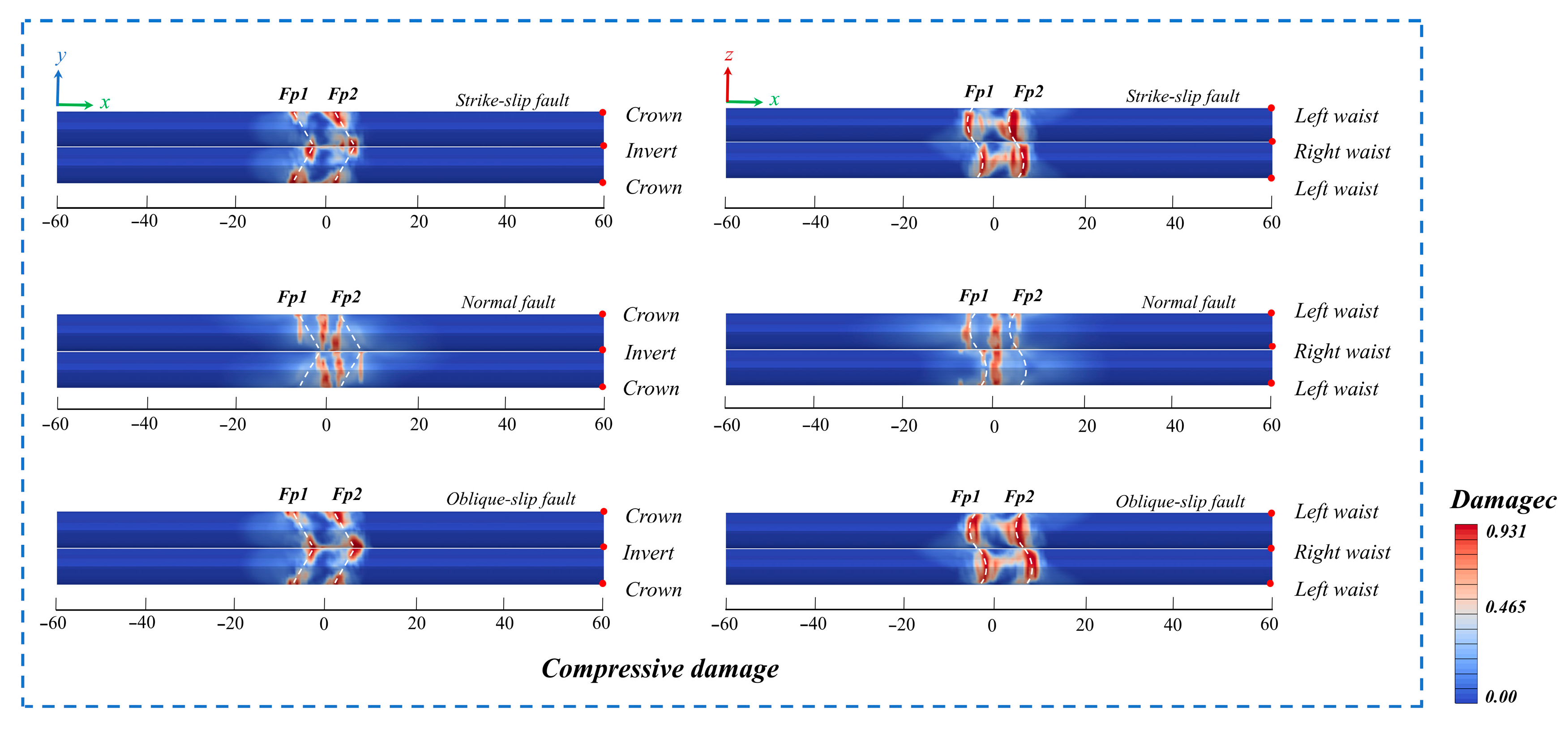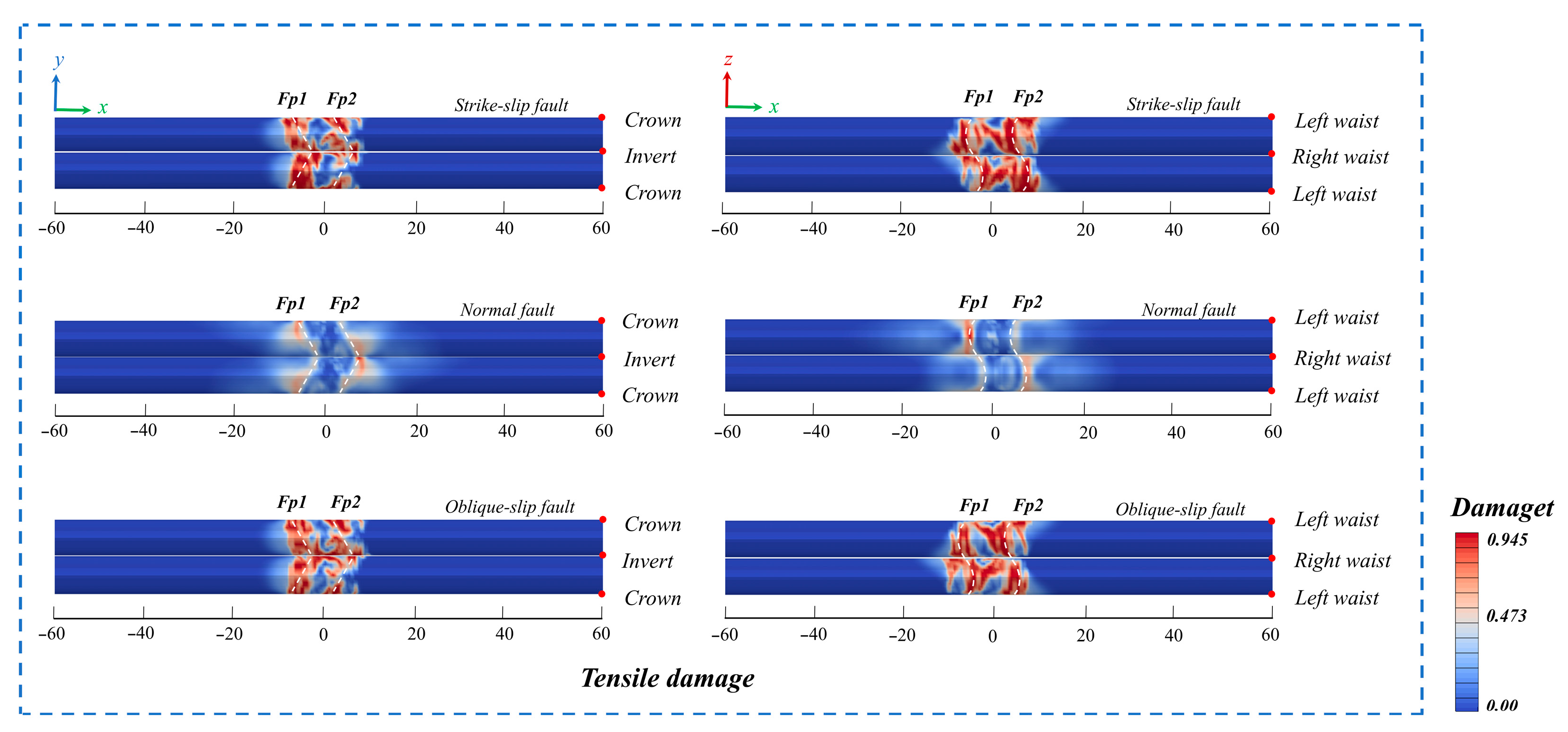 3.2. Influence of Different Fault Displacement Forms on Tunnels