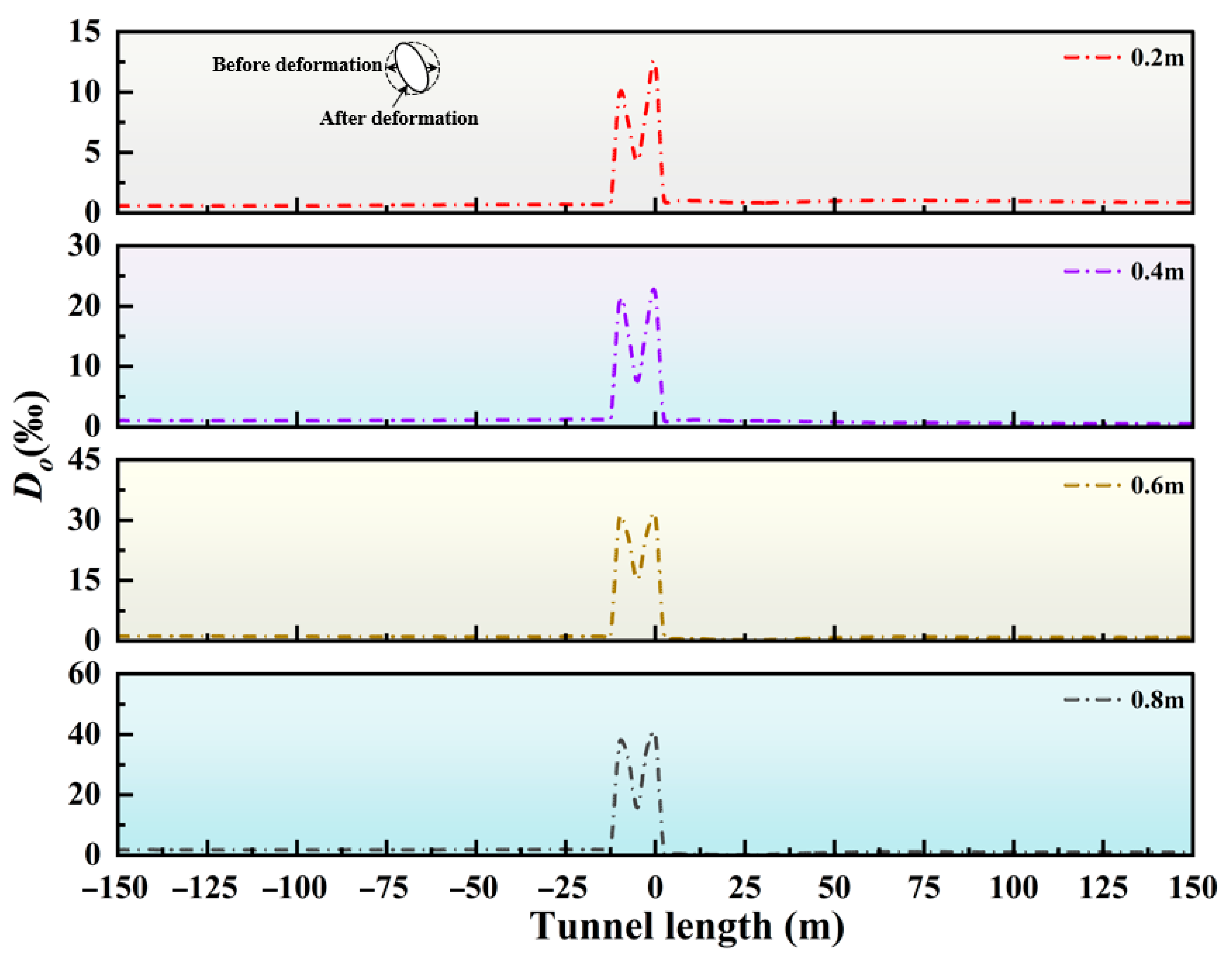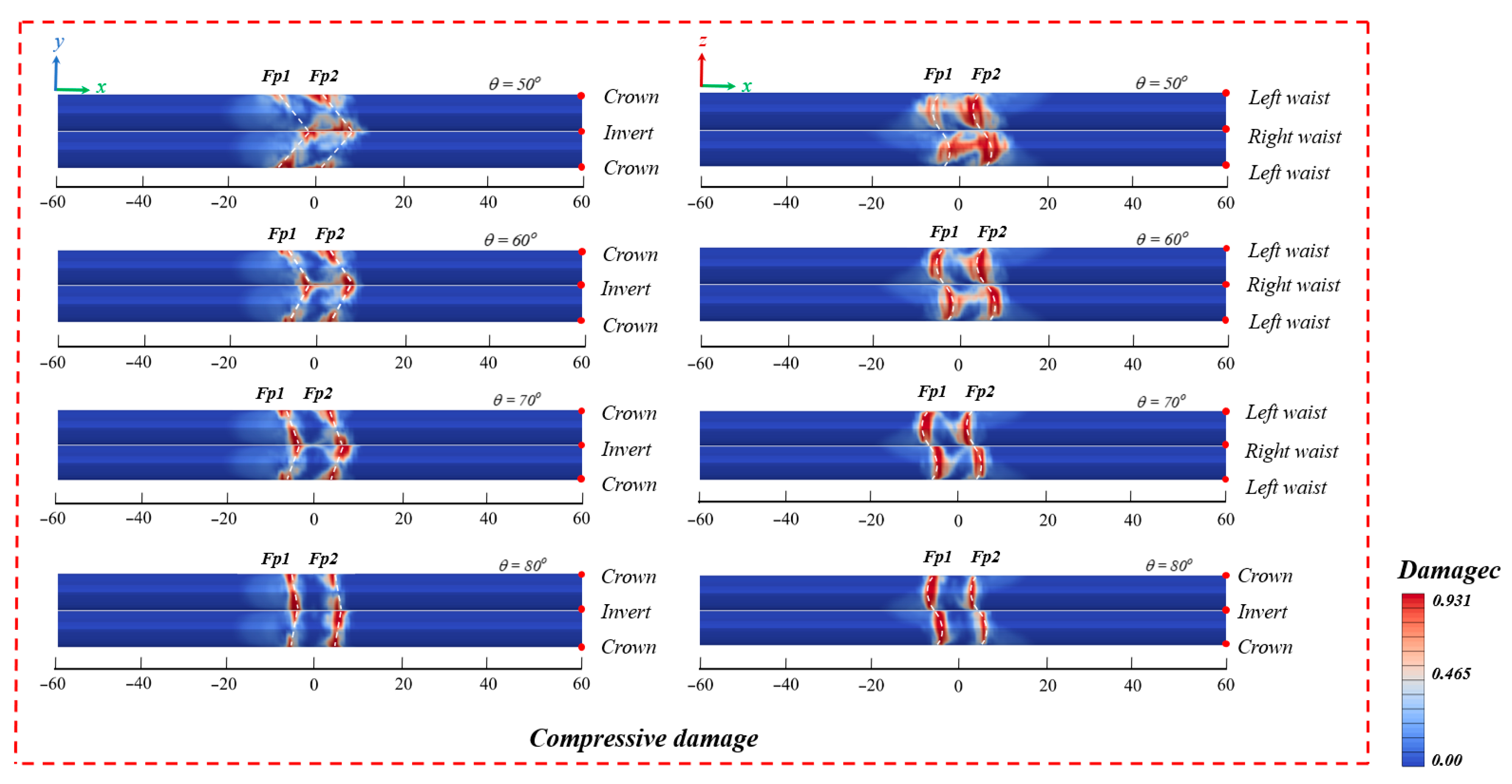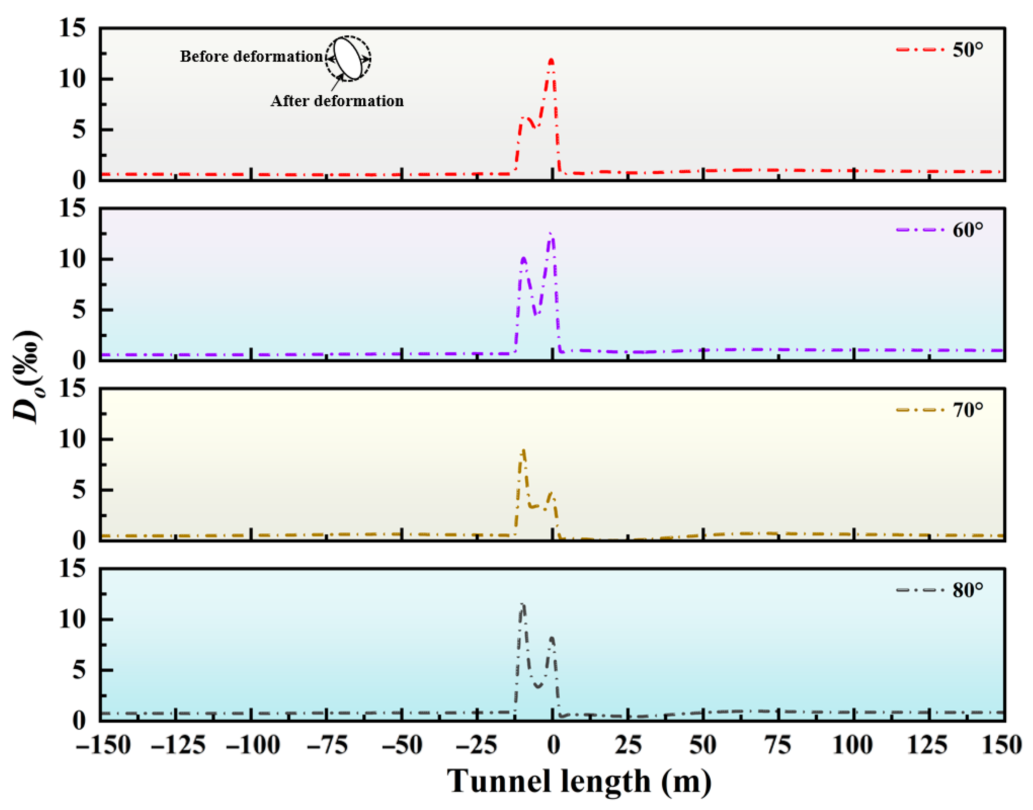 - Impact of fault dip angle: With the increase in the dip angle, the failure mode of the tunnel shifts from a tension–compression composite form to a tension–shear composite form. When the dip angle is small, the horizontal component of the fault displacement is significant, and the affected area is extensive. When the dip angle is large, the tension–shear coupling effect becomes more prominent. The deformation becomes more concentrated, resulting in a reduction of approximately 40% in the damaged area of the slip surface, and the propagation of damage towards the center of the fault zone is attenuated. Thus, in practical engineering, it is preferable for the tunnel to cross the fault at a large angle.