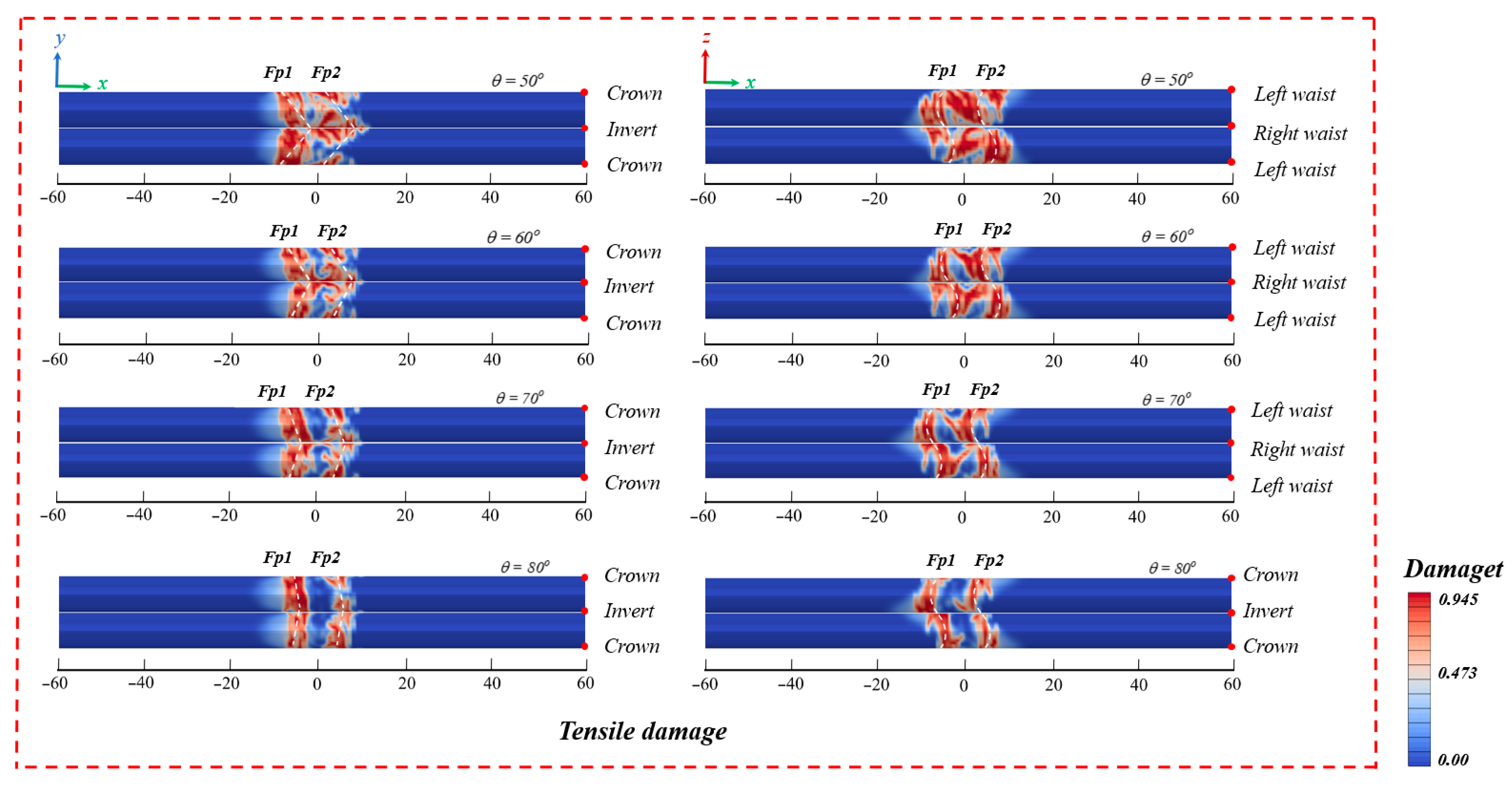 - Tunnel damage is more severe under strike-slip faulting than under oblique-slip faulting. This is evidenced by a maximum Mises stress of 12.21 MPa under strike-slip motion, which is 30–40% greater than the 11.91 MPa observed under oblique-slip conditions.