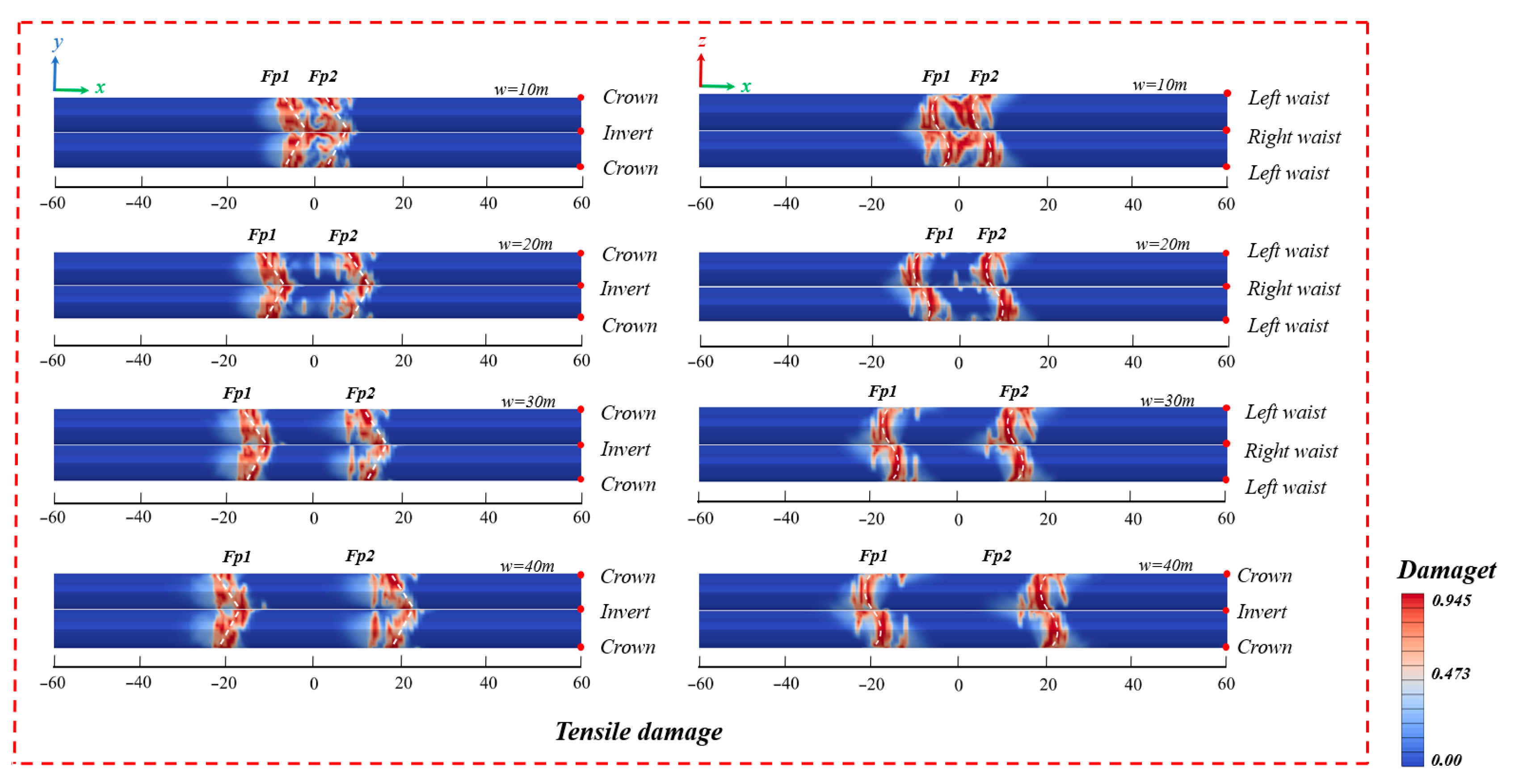 - Influence of the fault zone width: A relatively narrow fault zone (10 m) leads to local concentrated damage, while a relatively wide fault zone (40 m) makes the damage distribution more scattered. When crossing a 40 m wide fault zone, the degree of influence on the center of the fault zone is decreased by 30% compared to the case of a 10 m fault zone, and the damage path is longer. In engineering applications, it is recommended to prioritize the crossing plan of a relatively wide fault zone to realize the transformation from “concentrated shearing” to “distributed bending”, which is in line with the design concept of “using softness to counter hardness”.