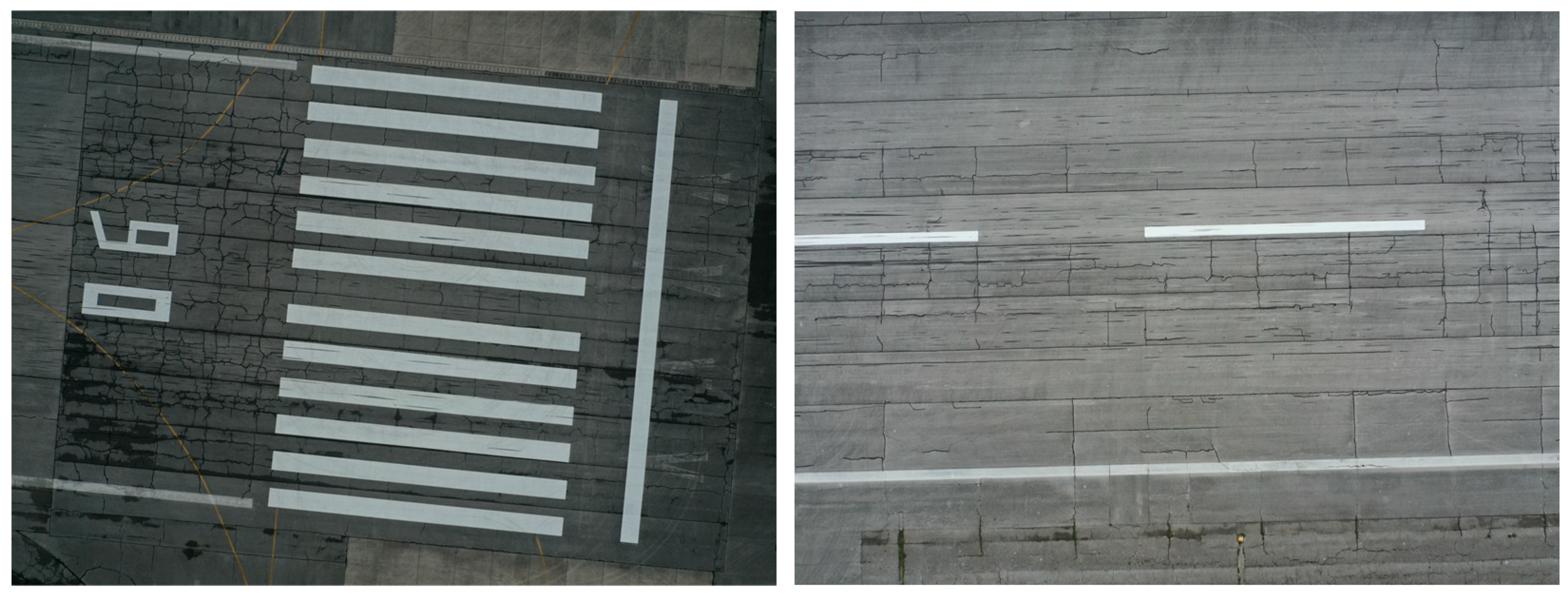 To ensure that the proposed model can be generalized for real-world practical applications, images were intentionally captured under diverse environmental conditions, including various lighting scenarios (e.g., sunny, cloudy, low-angle light) and mild weather variations (e.g., light winds and moderate humidity). The surveys also covered both runways and taxiways with different surface ages, maintenance background (including the presence of sealed cracks), and textures.