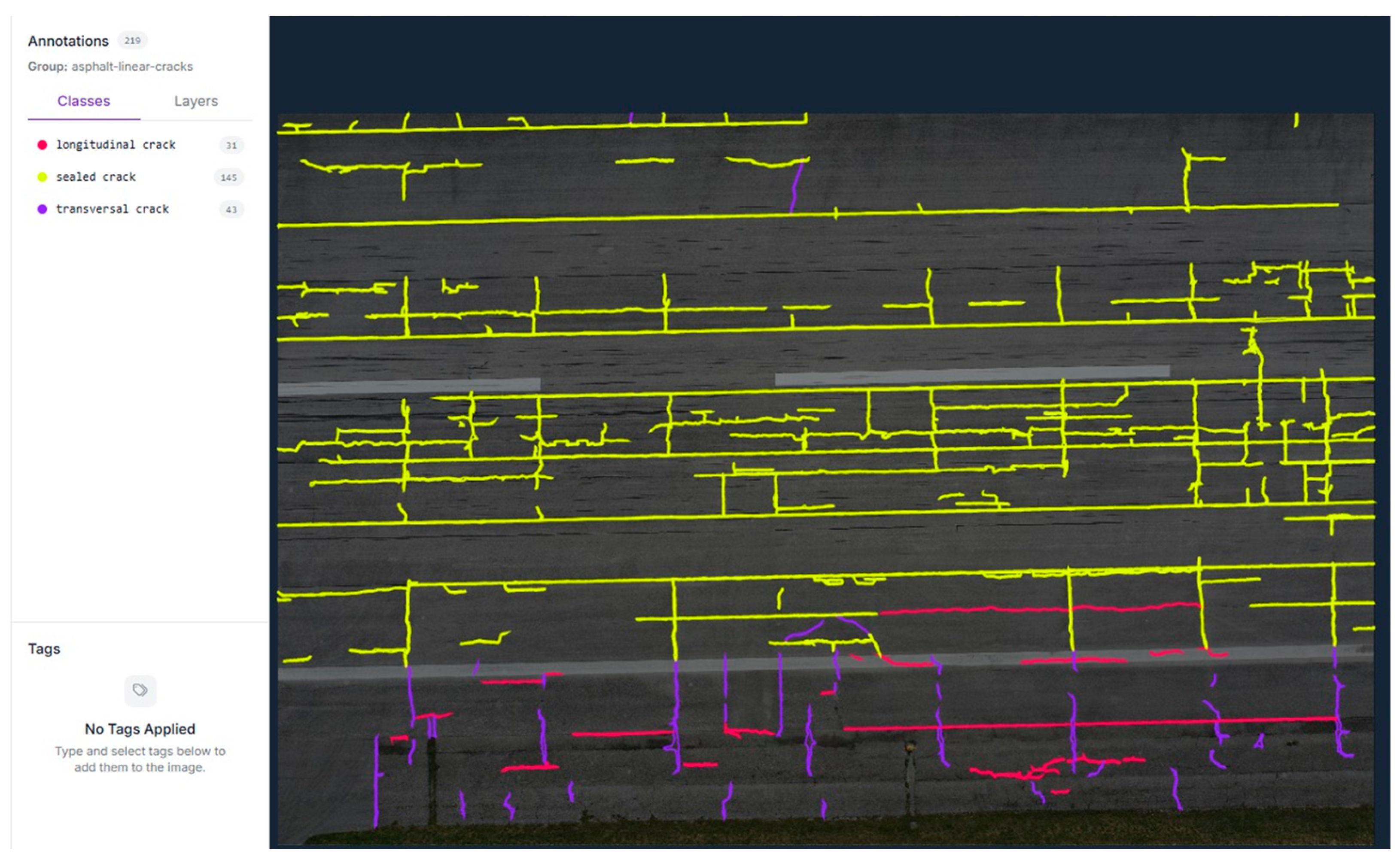 After acquiring all high-resolution imagery over the studied airfields using the lightweight UAV, the dataset was annotated at the pixel level. The annotation process aimed to delineate and classify pavement distresses with high precision, including micro-cracks and low-contrast ones. This level of detail is essential for training the AI model capable of accurate segmentation.