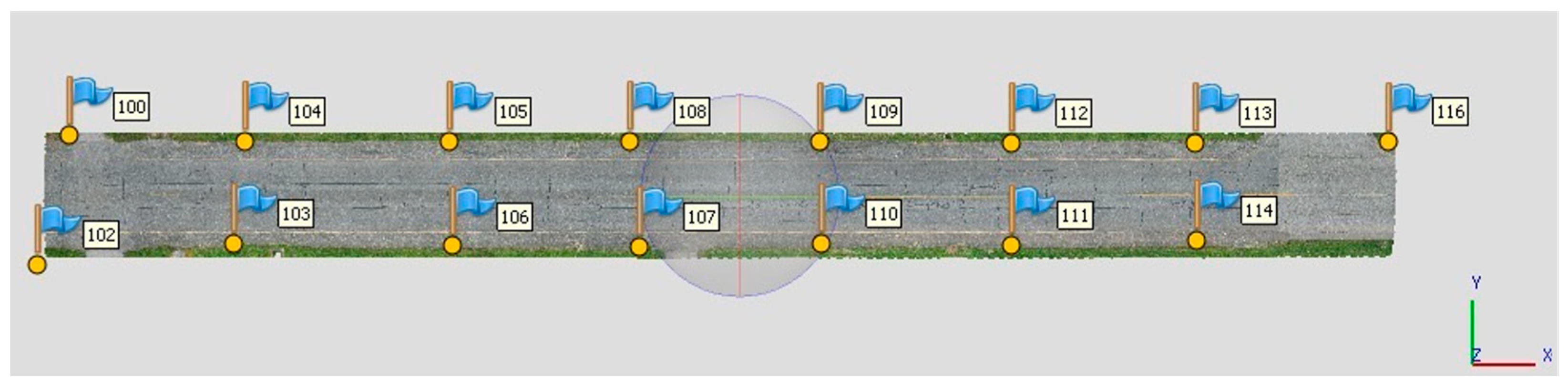 Figure 4a). These white and red markers, each measuring 30 × 30 cm, were positioned every 25 m on both sides of the pavement. Their coordinates were precisely georeferenced using a high-accuracy GPS system (see