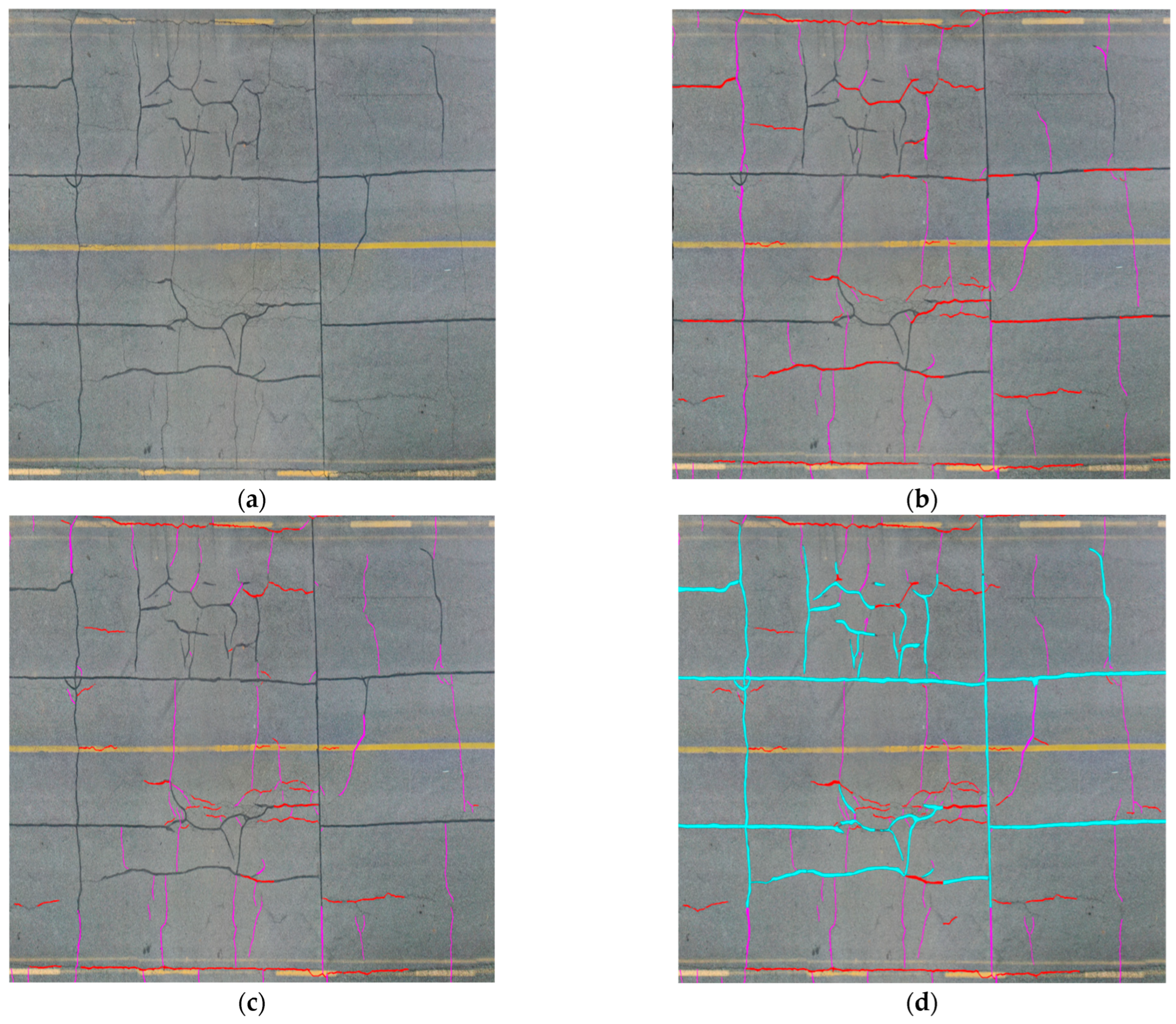 Figure 7d shows the results obtained by processing the orthophoto of Sample Unit_1 with database DS-C, in which sealed cracks are both included and annotated with a dedicated semantic mask.