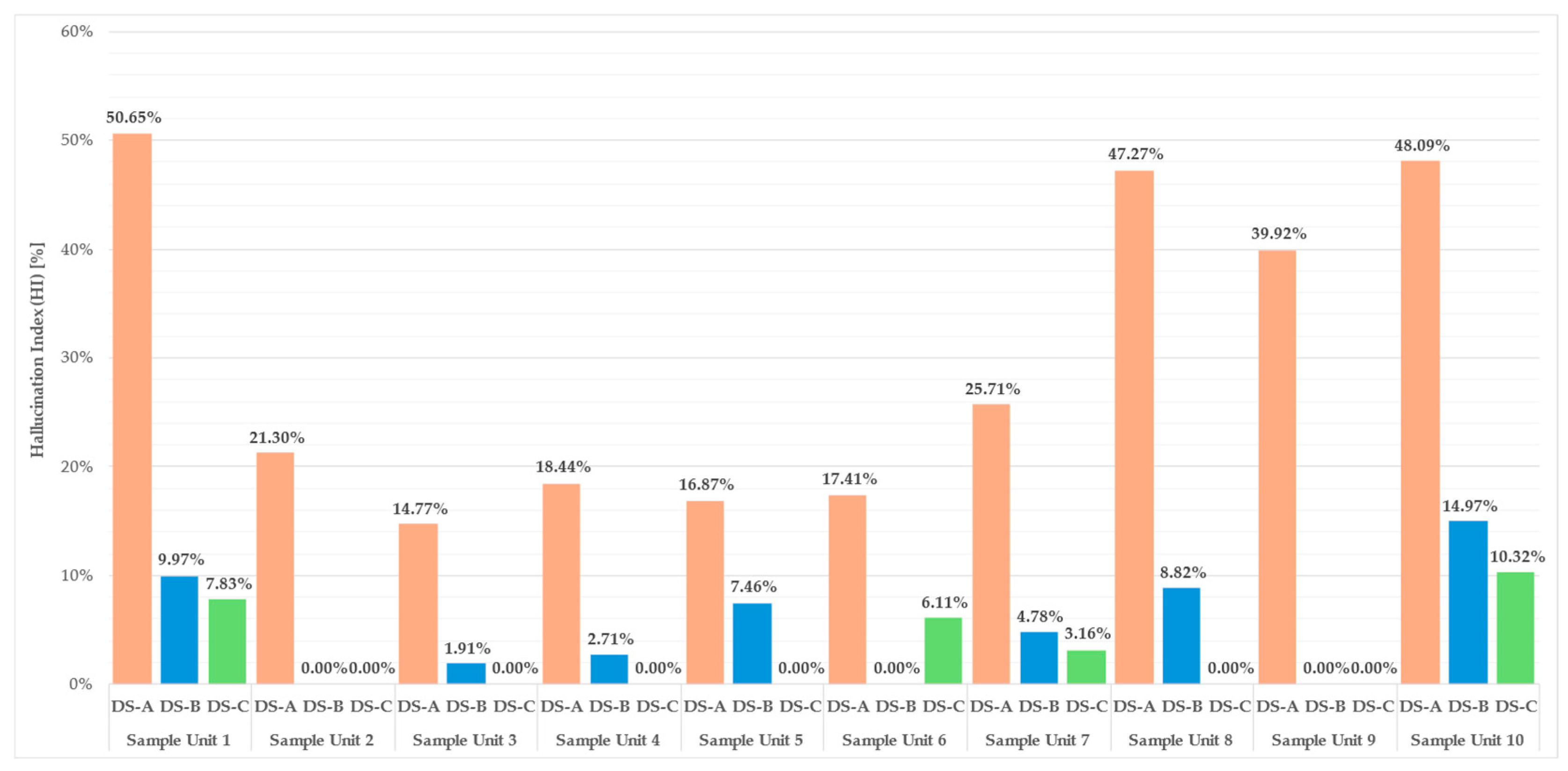 Figure 12 clearly demonstrate that the DS-C mostly has the best performance in the detection, segmentation, and calculation of the final PCI value of each sample unit. Basing the model’s performance evaluation only on the PCI values can misinterpret the outcome since the DS-A seems to perform better than the DS-B. In fact, the PCI values calculated via DS-A in some cases showed minor errors just because there are many false positive segmented cracks that compensate for the missing cracks. Therefore, to properly evaluate the performance of the trained models, a robust assessment should consider all three metrics: the Hallucination Index (