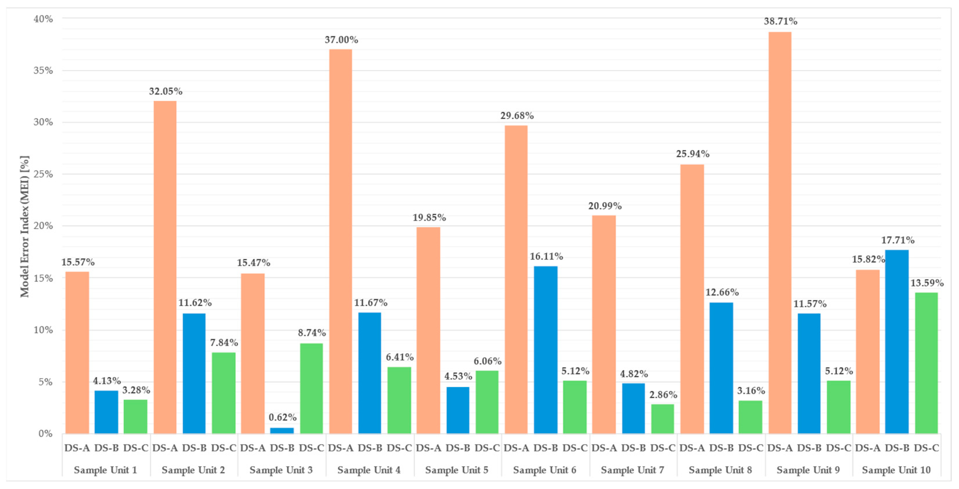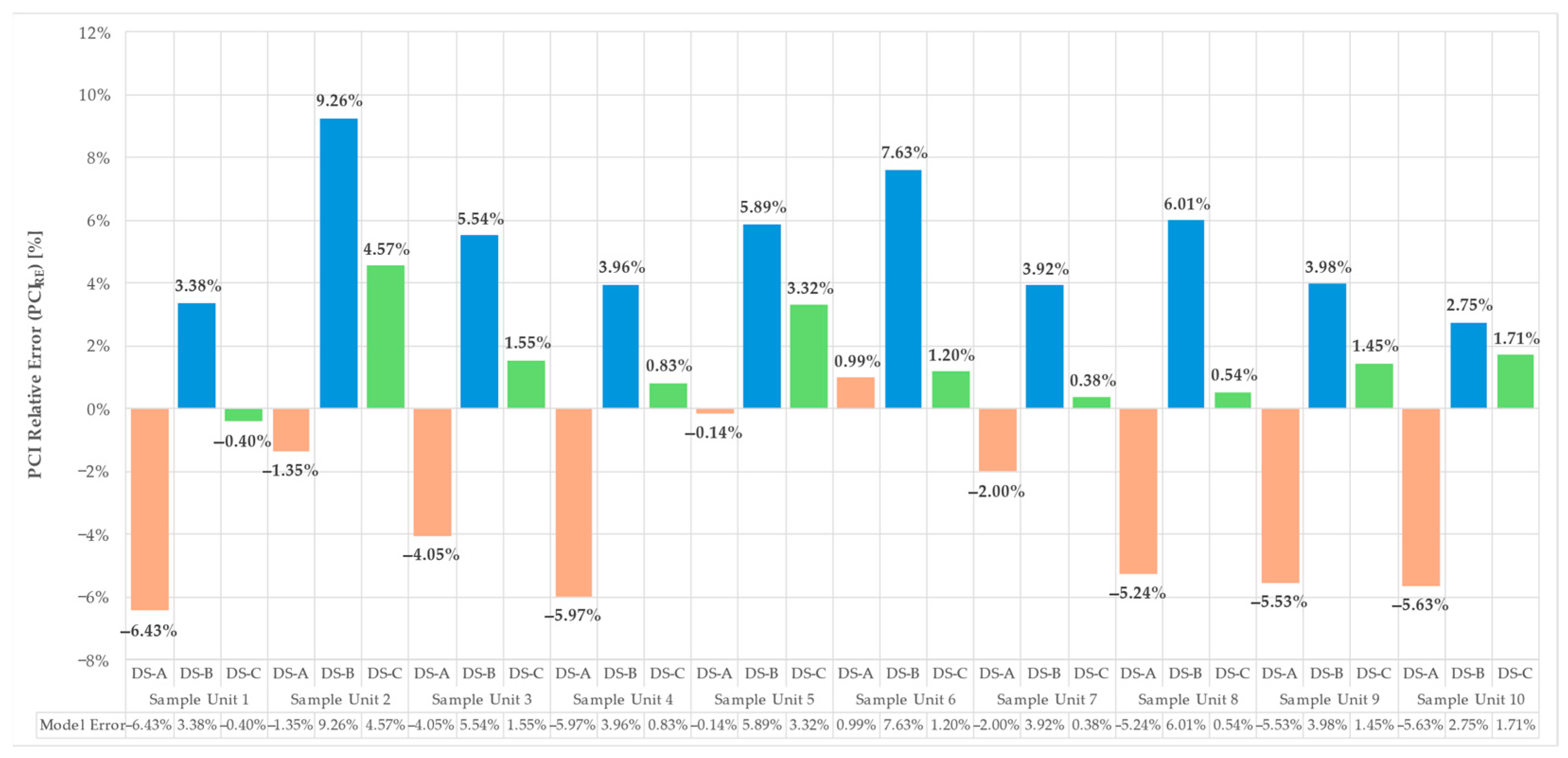 PCIRE) [%], which is the error rate between the PCI calculated by AI models (DS-A, DS-B, and DS-C) and the actual PCI assessed via on-site inspection, is calculated through Equation (3).