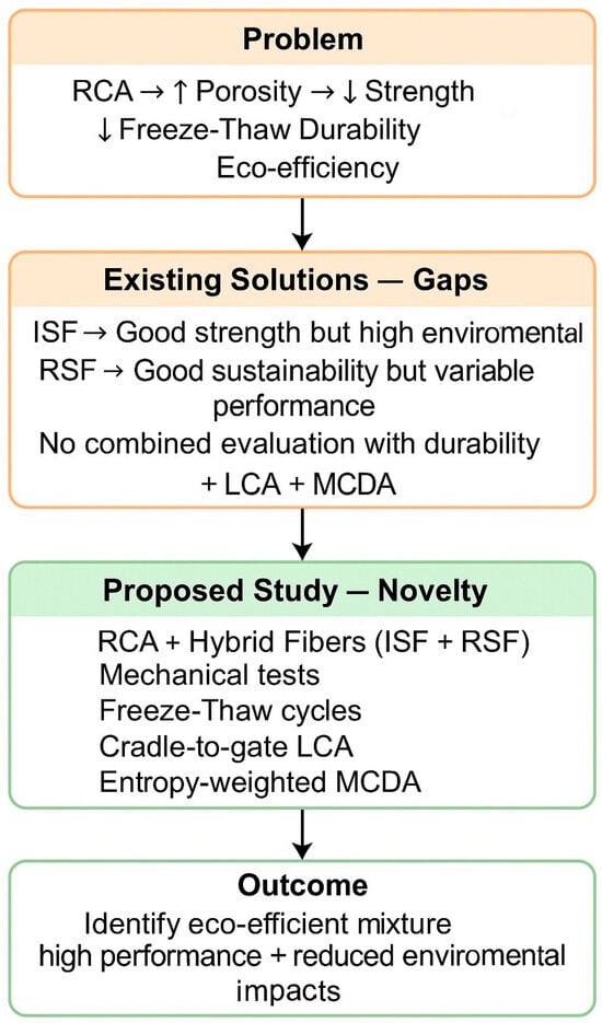 Addressing these gaps, the present study proposes a comprehensive experimental–environmental framework that evaluates 20 RCCP mixtures incorporating RCA and hybrid steel fibers and identifies optimal mixtures using combined LCA and MCDA. This integrated methodology—linking hybrid fiber synergy, RCA utilization, freeze–thaw resistance, and environmental efficiency—constitutes a novel contribution to the existing RCCP and hybrid fiber literature. A concise conceptual diagram (Figure 1) is included to illustrate the research workflow and highlight the study’s originality.