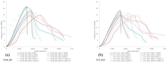 Compressive stress–strain relationship: (a) N100_R0 series and (b) N75_R25 series at 28 days.
