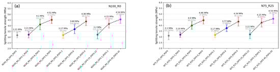 Splitting tensile strength (MPa) and CoV (%) for RCCP: (a) N100_R0 and (b) N75_R25 at 28 days.