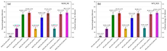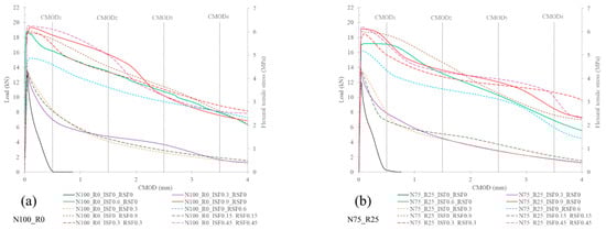 Figure 9 also highlights differences in peak stress, stiffness, and post-peak behavior. N100_R0 exhibited the largest peaks and steepest slopes; N75_R25 curves were flatter, indicating a reduced stiffness with RCA. Post-peak softening was more gradual in fiber-reinforced mixes, consistent with the toughness values in Table 7. increased substantially with fiber volume, from 14.9 N/mm (N75_R25_ISF0_RSF0) to 41.7 N/mm (N75_R25_ISF0.45_RSF0.45). The latter surpassed plain, ISF0.9, and RSF0.9 at an equal RCA by 180%, 31%, and 20%, respectively. The more extended post-peak tails in HSF curves (e.g., N75_R25_ISF0.45_RSF0.45) in Figure 9b corroborate this ductility gain.
