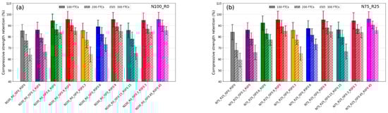 Mechanical performance at 28 days and freeze–thaw durability (100, 200, and 300 cycles) were assessed using four replicate specimens for each data point. Results are reported as mean values with corresponding coefficients of variation (CoVs). Outlier detection was performed using Grubbs’ test, Dixon’s Q test, and boxplot analysis, and outliers were removed where justified. In all figures, error bars indicate variability, and CoV (%) values are shown in parentheses.