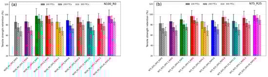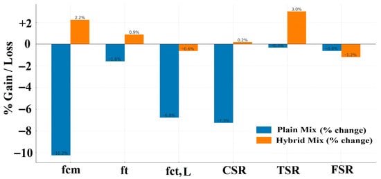 Figure 10 summarizes the 28-day splitting tensile strength (). Both RCA and fiber configuration influenced performance, with steel fibers, especially hybrids, providing the largest gains. Plain controls were lowest (3.15 MPa and 3.10 MPa for N100_R0 and N75_R25), with a slight decline at higher RCA due to a weaker ITZ and higher porosity [].