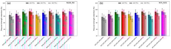 Flexural behavior from 3PNBBT at 28 days, initial flexural strength , and residual strengths to are reported in Table 8. The results were sensitive to RCA and fiber strategy. Initial strengths ranged from 3.86 MPa (N75_R25_ISF0_RSF0) to 6.21 MPa (N75_R25_ISF0.45_RSF0.45). In plain mixes, raising RCA from 0% to 25% reduced by ~7% (4.14 to 3.86 MPa), consistent with the higher porosity and weaker ITZ []. Steel fibers, particularly in HSF mode and at 0.6–0.9%, substantially improved post-cracking capacity. For example, N100_R0_ISF0.45_RSF0.45 delivered the highest (6.25 MPa) and strong residuals (6.1 and 2.6 MPa for and , outperforming ISF-only (e.g., N100_R0_ISF0.9_RSF0) and RSF-only (e.g., N100_R0_ISF0_RSF0.9) counterparts at comparable dosages.